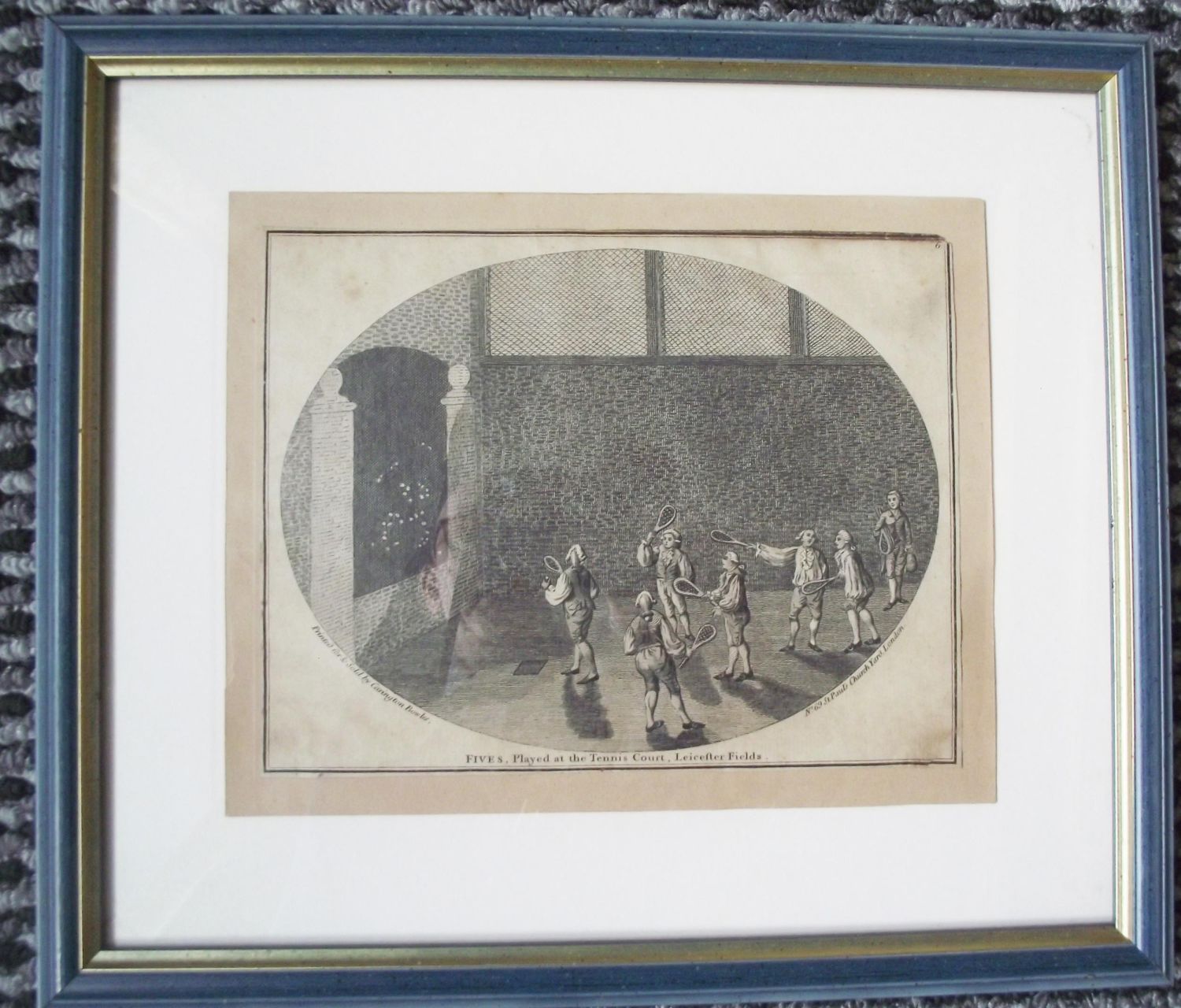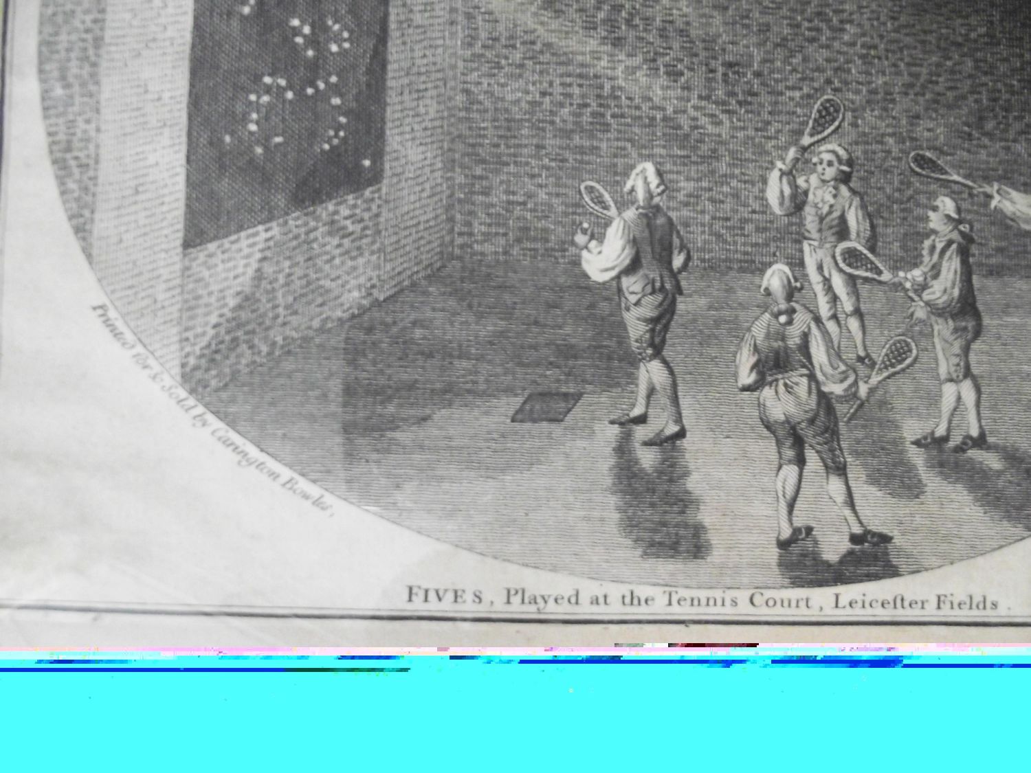 Engraving/ print Fives, played at the Tennis Court, Leicester Fields CARRINGTON BOWLES, 1724/1793 printer no 69 St Pauls church yard London, Engraving, first published London: 22 September 1788.laid on card 7×9 approx. framed 13×11 approx.
