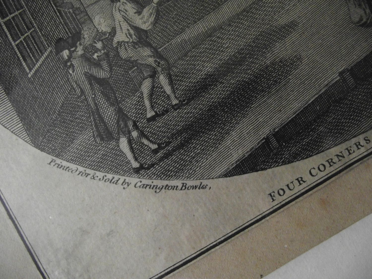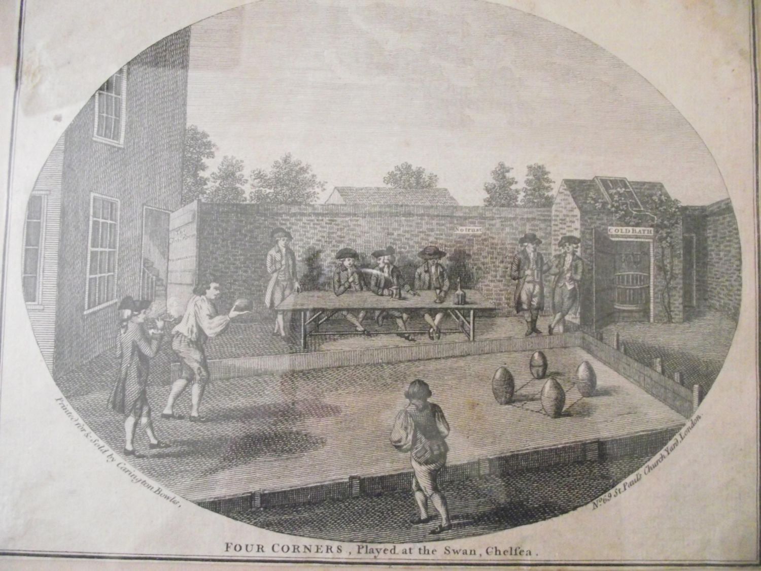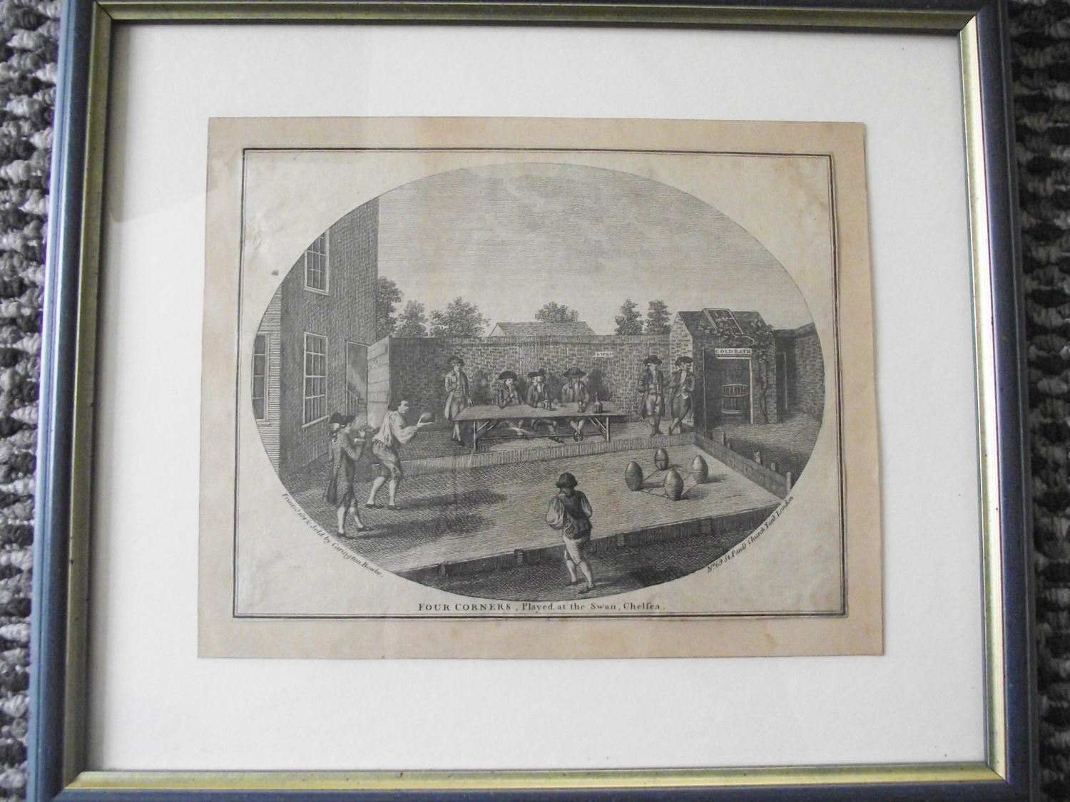 Engraving/ print Four corners played at the swan Chelsea , printed and sold by CARRINGTON BOWLES,1724/1793 printer no 69 St Pauls church yard London laid on card 7×9 approx. framed 13×11 approx.