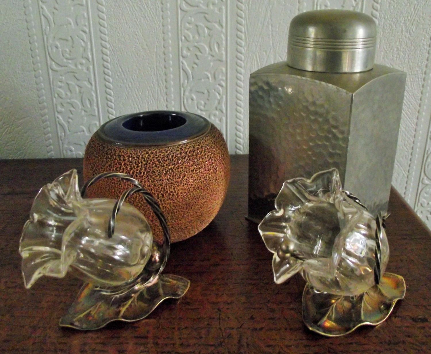Pair of glass & Epns leaf shaped salts with spoons + antique Royal Doulton match striker/holder with cobalt blue rim + art deco style hand hammered pewter tea caddy James Dixon & sons