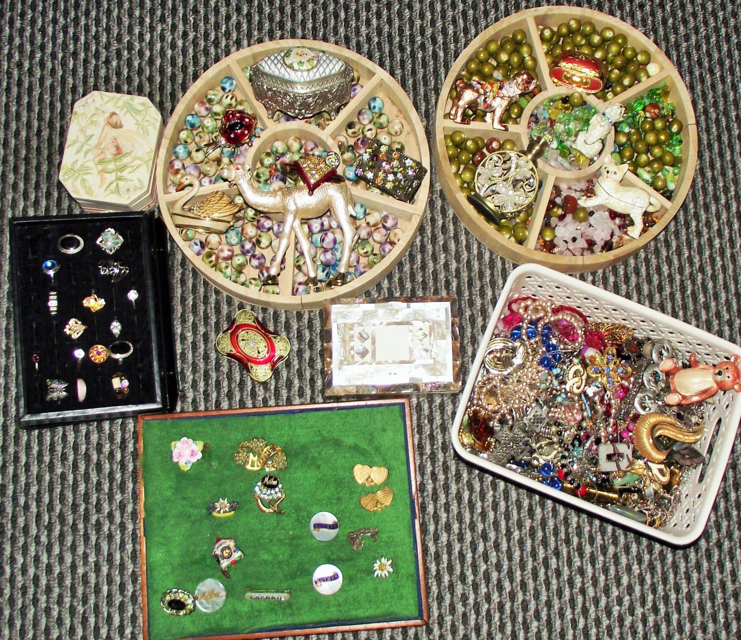 large collection of costume jewellery earrings etc. + 2 trays of costume jewellery making beads + selection of novelty trinket boxes in form of animals & small boxes +selection of broches including Mispah brooches and selection of dress rings