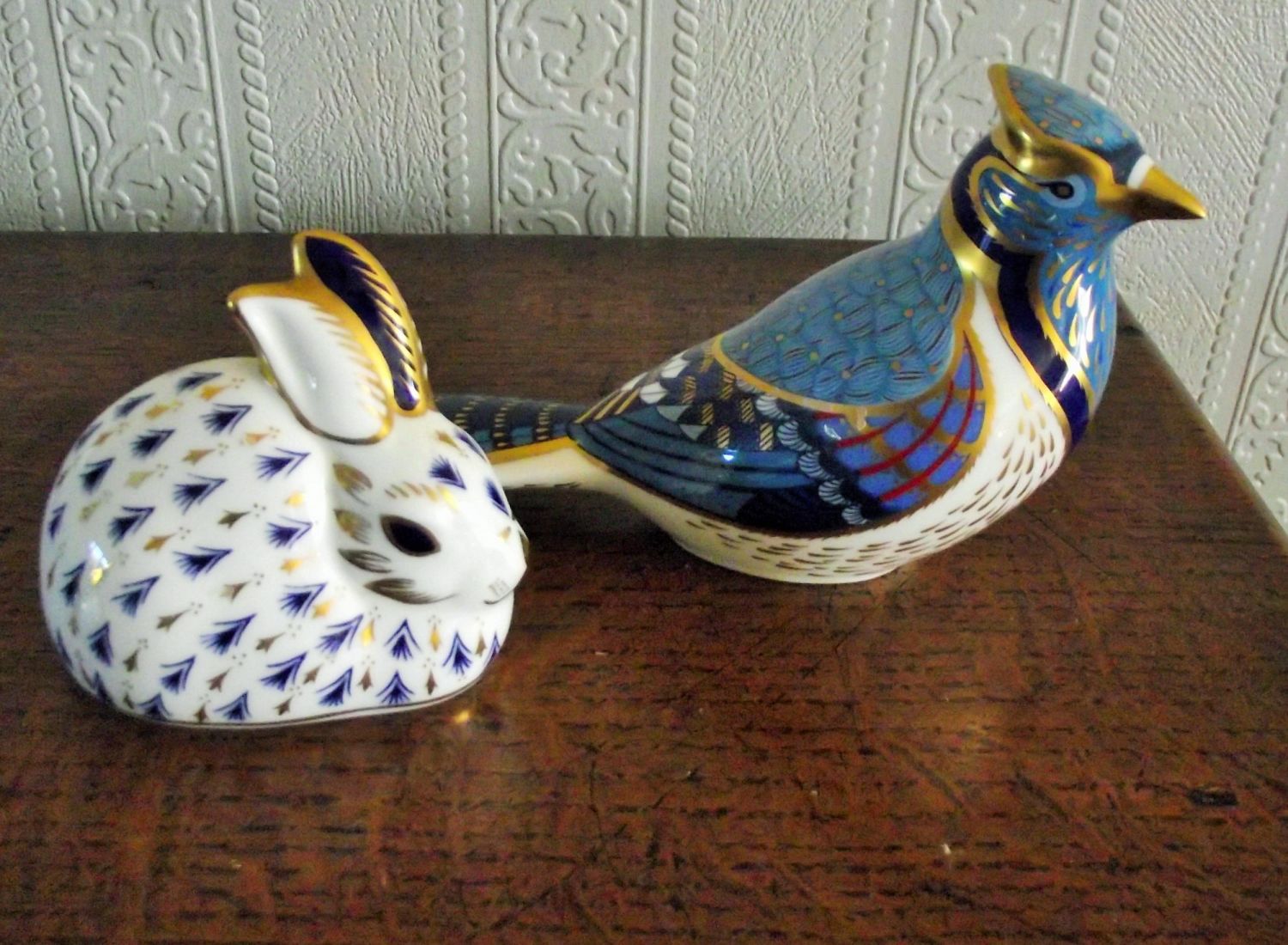 Royal Crown Derby Blue jay bird paperweight + Royal Crown derby rabbit paperweight both with silver stoppers