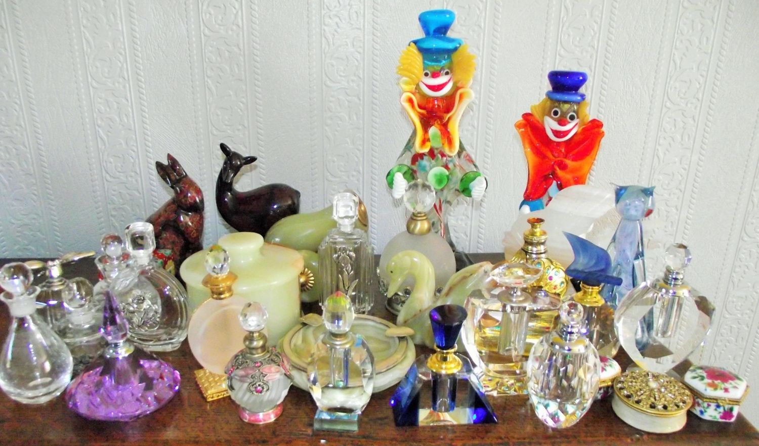 Mixed large lot collectibles Inc. scent bottles , Murano clowns , Onyx wares , Enesco wares etc.