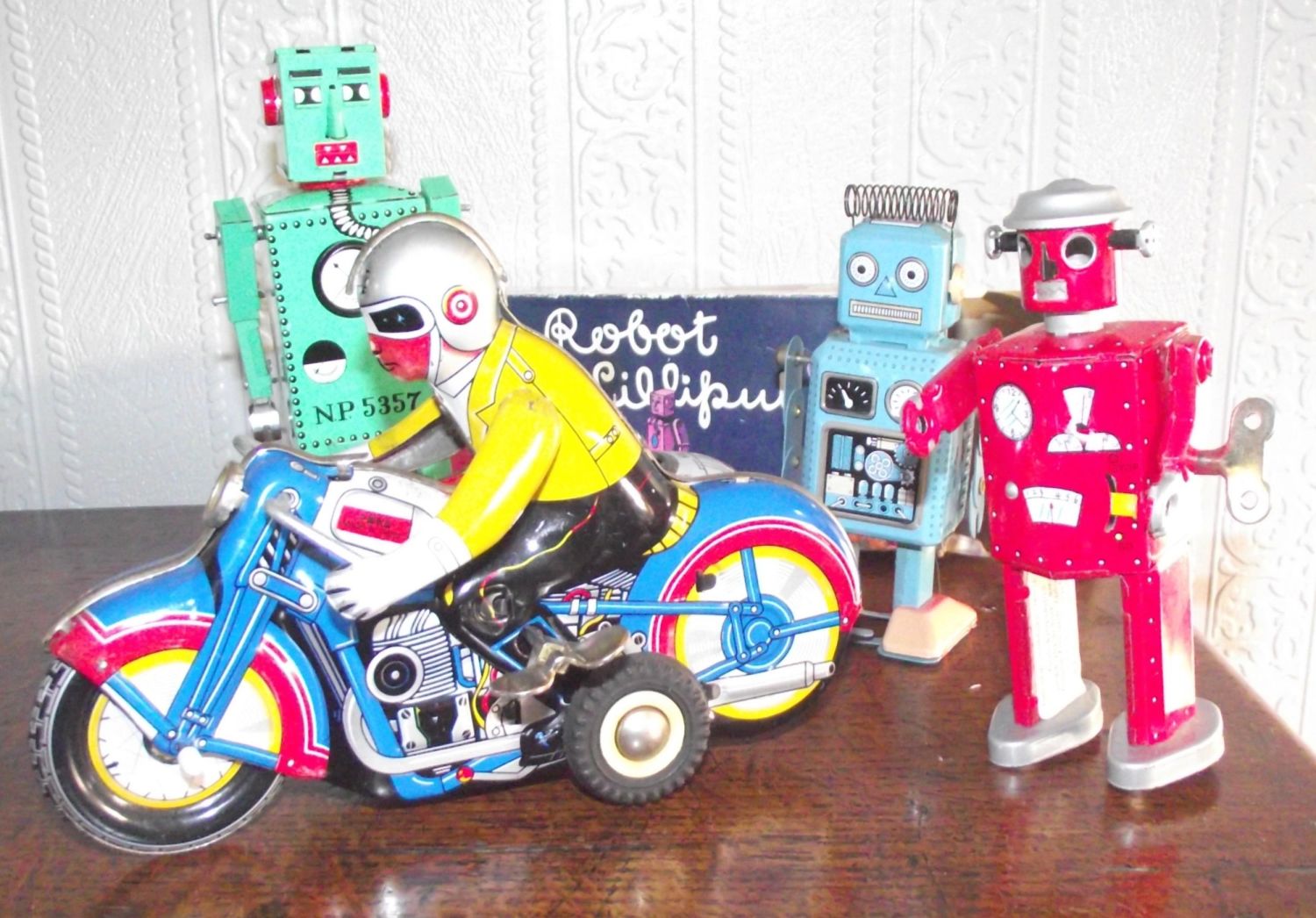 4x vintage tin plate mechanical toys inc 3 x robots (Lilliput) + motorcycle and sidecar