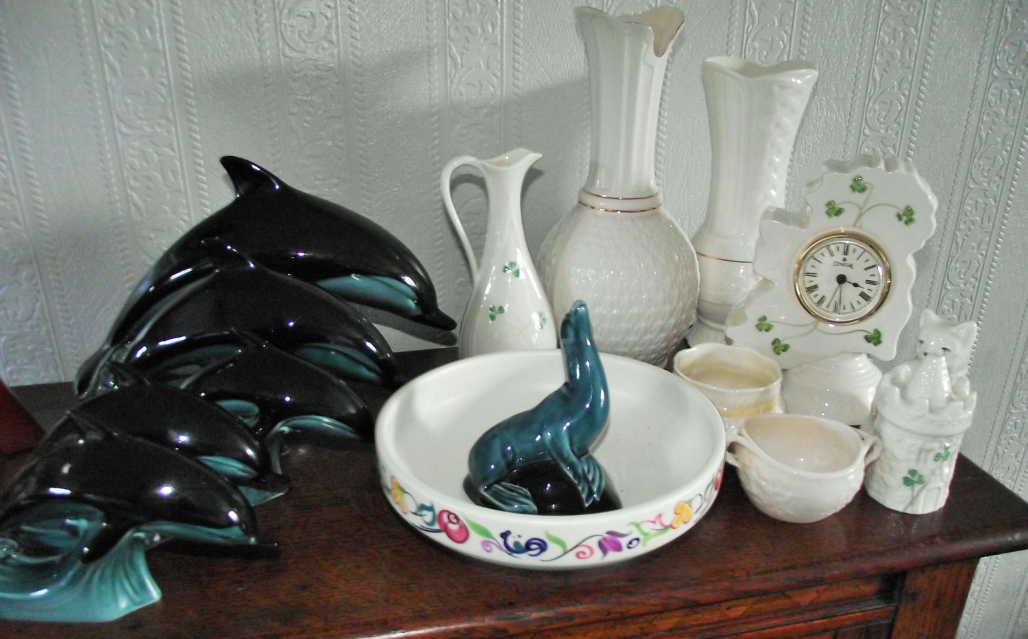 7 x pieces Belleek pottery + Donegal clock + Poole bowl , Poole Dolphins & Poole sea lion