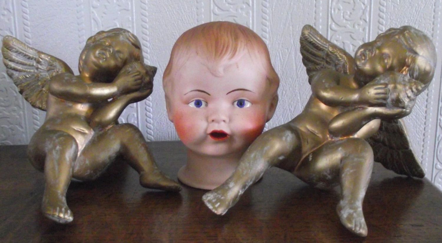 2x moulded porcelain cherub figures approx. 6 high + 2 piece moulded porcelain dolls head stamped with registration no 661200