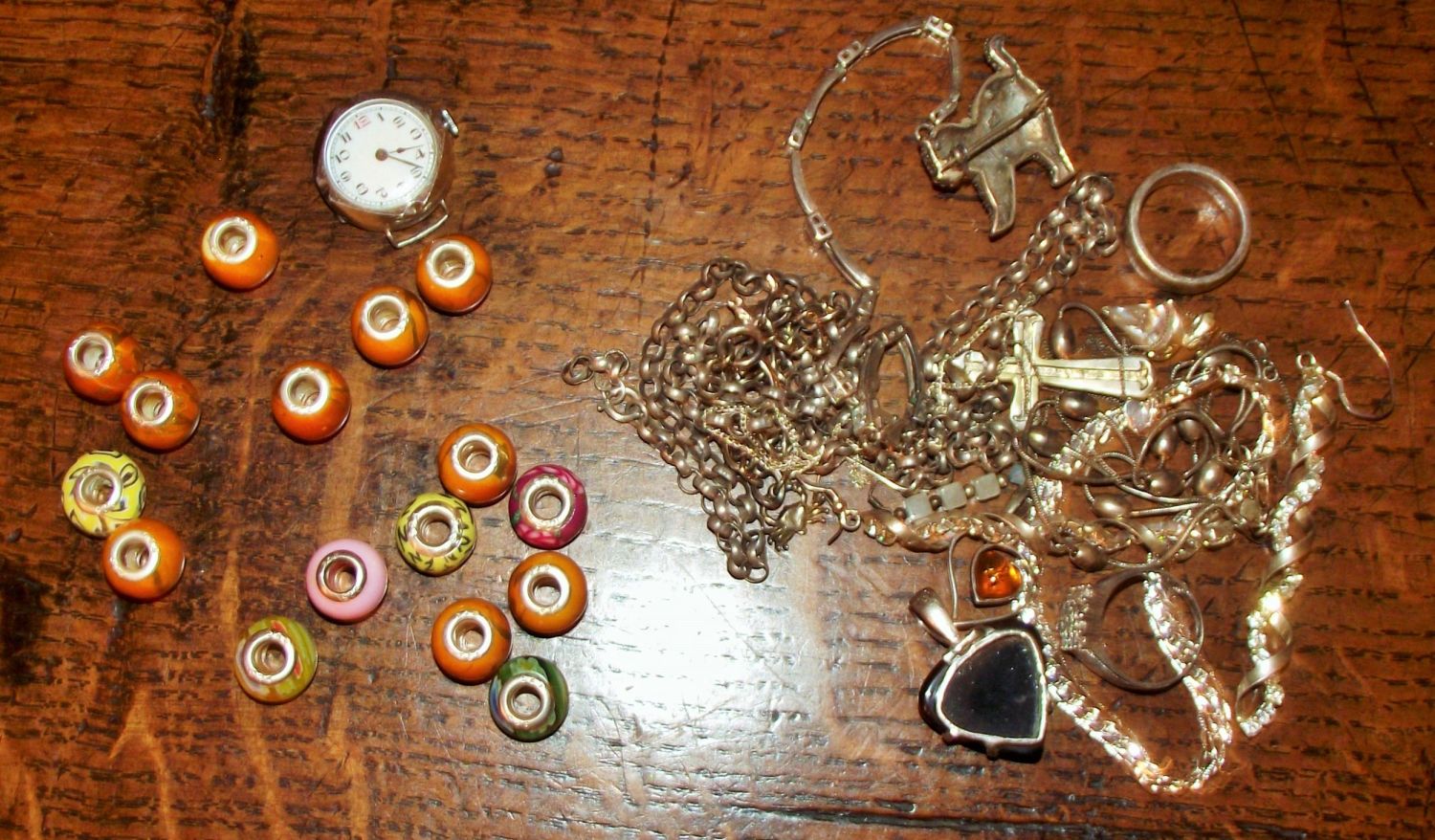Small selection of silver jewellery marked 925 & sterling + selection of bead charms with silver centres + silver ladies cased wrist watch 125g approx. not including beads or watch