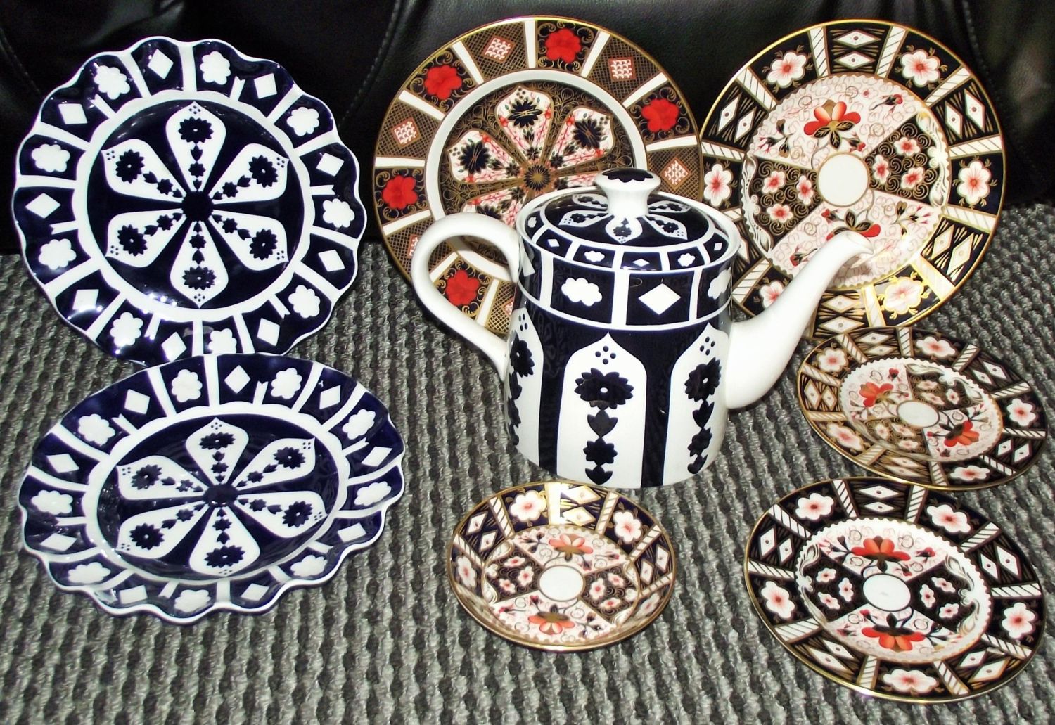 Royal crown derby 1128 pattern 8.5 plate ( Second) + Royal crown derby 8.5 2451 pattern plate + 2 x 61/4 2451 plates + small shallow dish + 2 scalloped edge unfinished derby plates * coffee pot ( 8 )