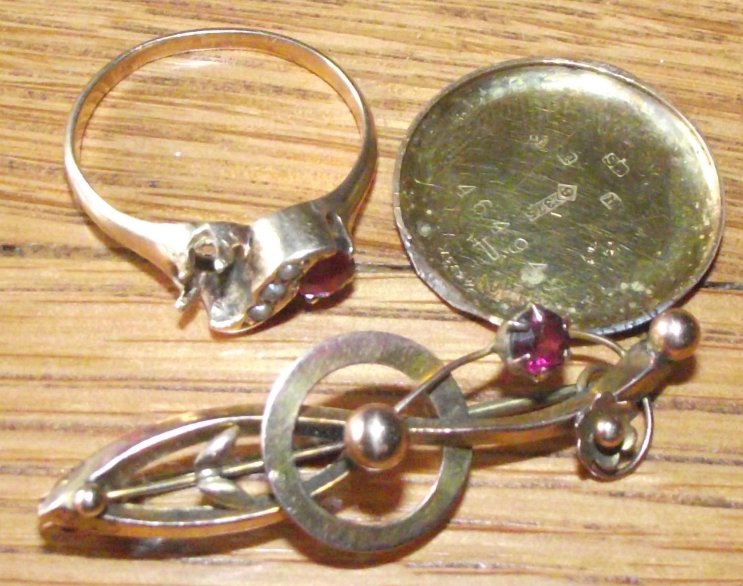 Selection of scrap gold Inc. 9ct gold watch back , 9ct pin brooch + 10k ring ( stones missing ) 4.7g approx.