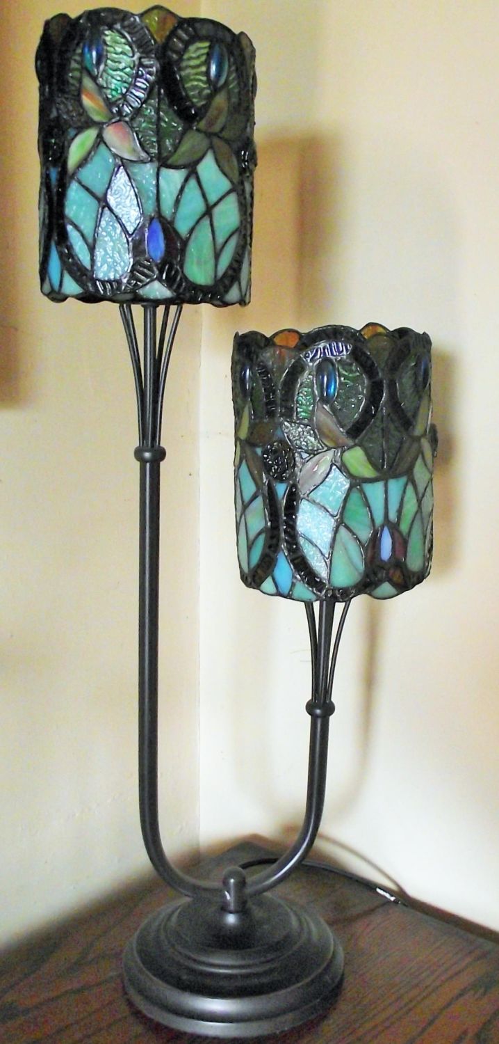 Twin stem table lamp with tiffany style shades