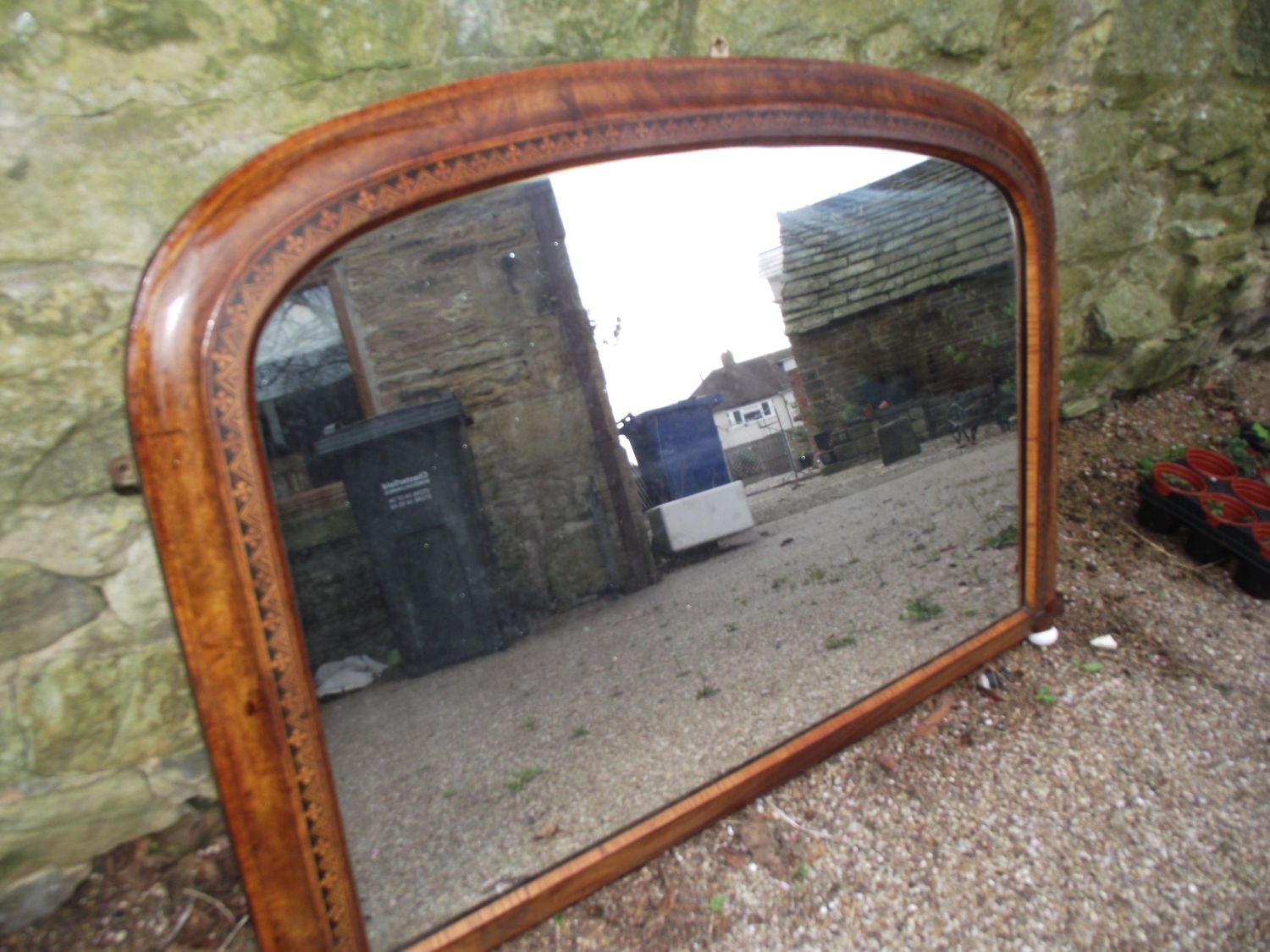 Edwardian arch topped over mantle mirror marquetry design raised on 2 small porcelain bun feet