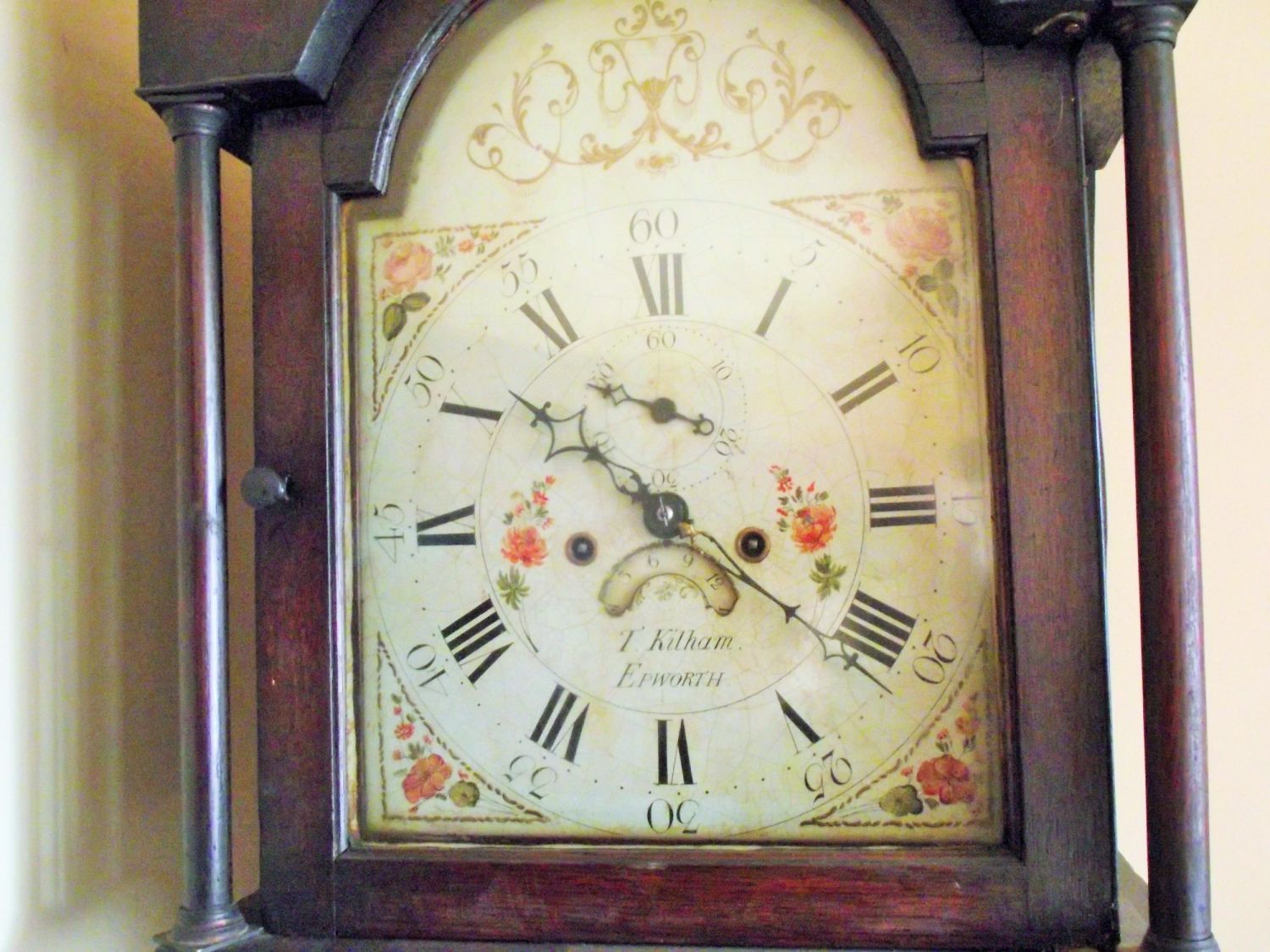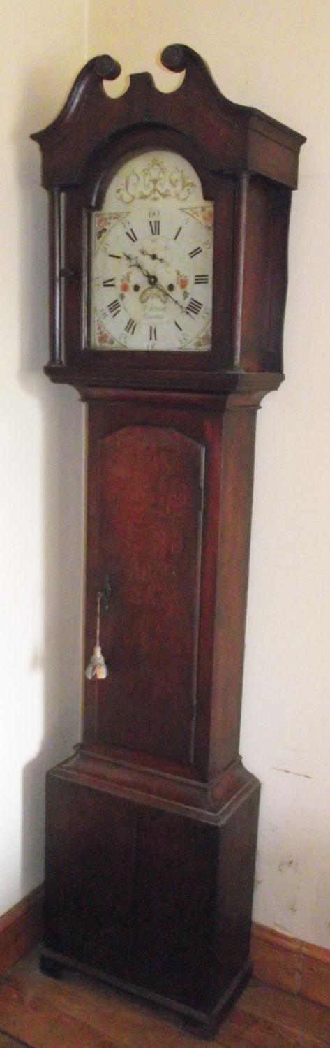 Lovely tall oak cased grandfather clock with painted dial T Kilham Epworth. ( Not seen working , key missing Approx 78 high