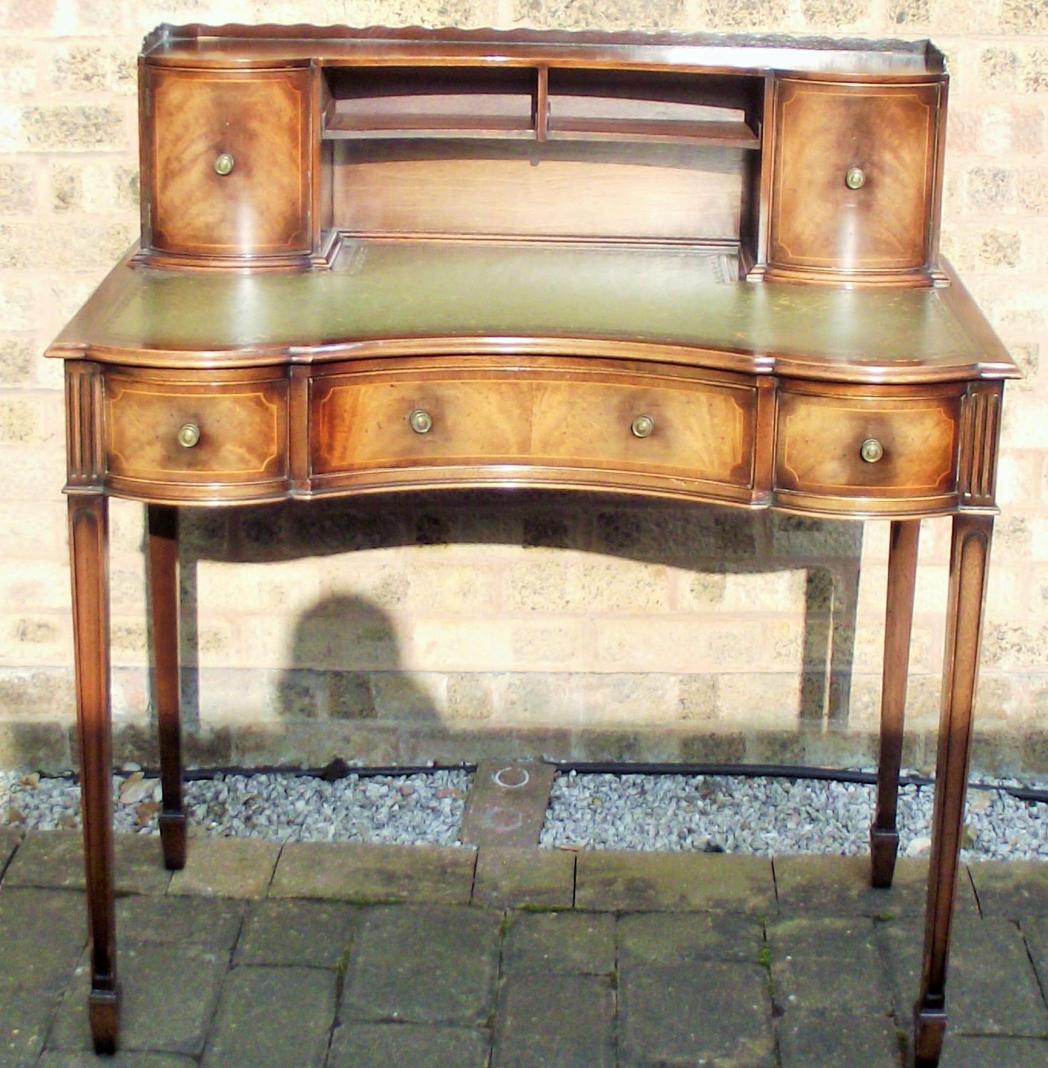 Edwardian style ladies serpentine front writing desk with small raised back small door either side concealing pigeon holes. 2 small & 1 long draw to front , green leather insert top