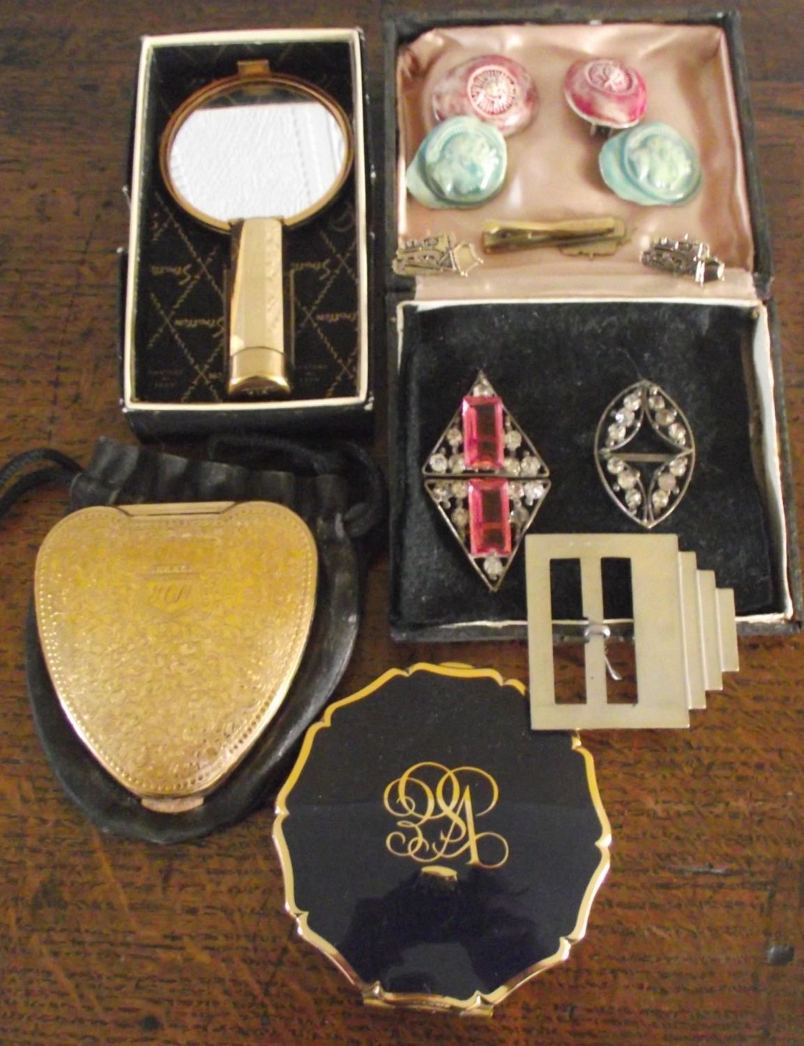 Rare vintage Stratton compact CSOE ( Venice Simplon Orient Express) + 1950S KGIU Cherie powder compact + 1950 Stratton lipstick holder mirror combined + 3x Art deco style belt buckles +Vintage Sophos bulldozer tie clip & cufflinks + 2 pairs of handmade clip on earring with embossed design