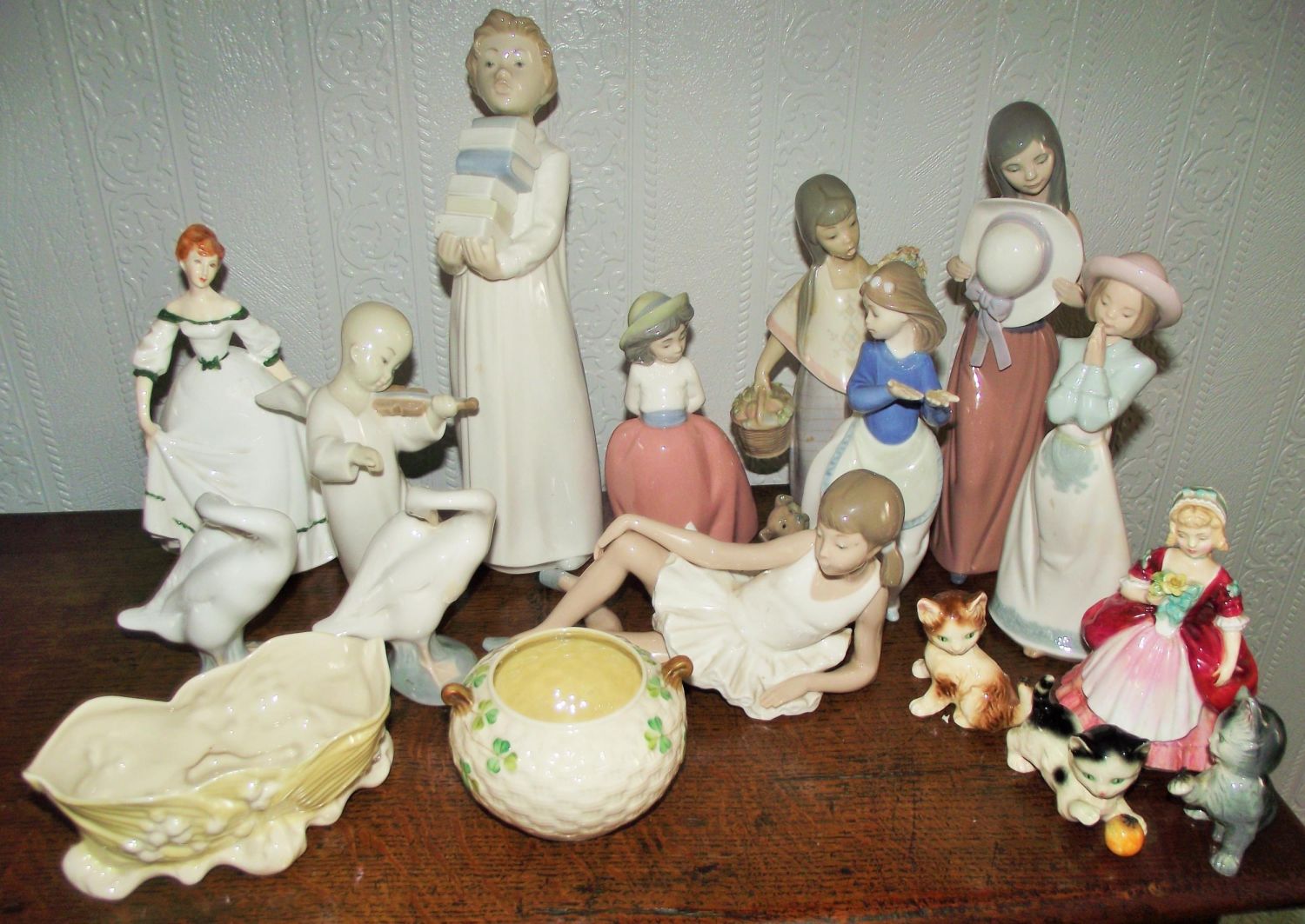 Collection of figurines inc . 3x Goebel , 2x royal Doulton figures ,10 x Lladro / Nao figures , 2 x pieces of Belleek pottery