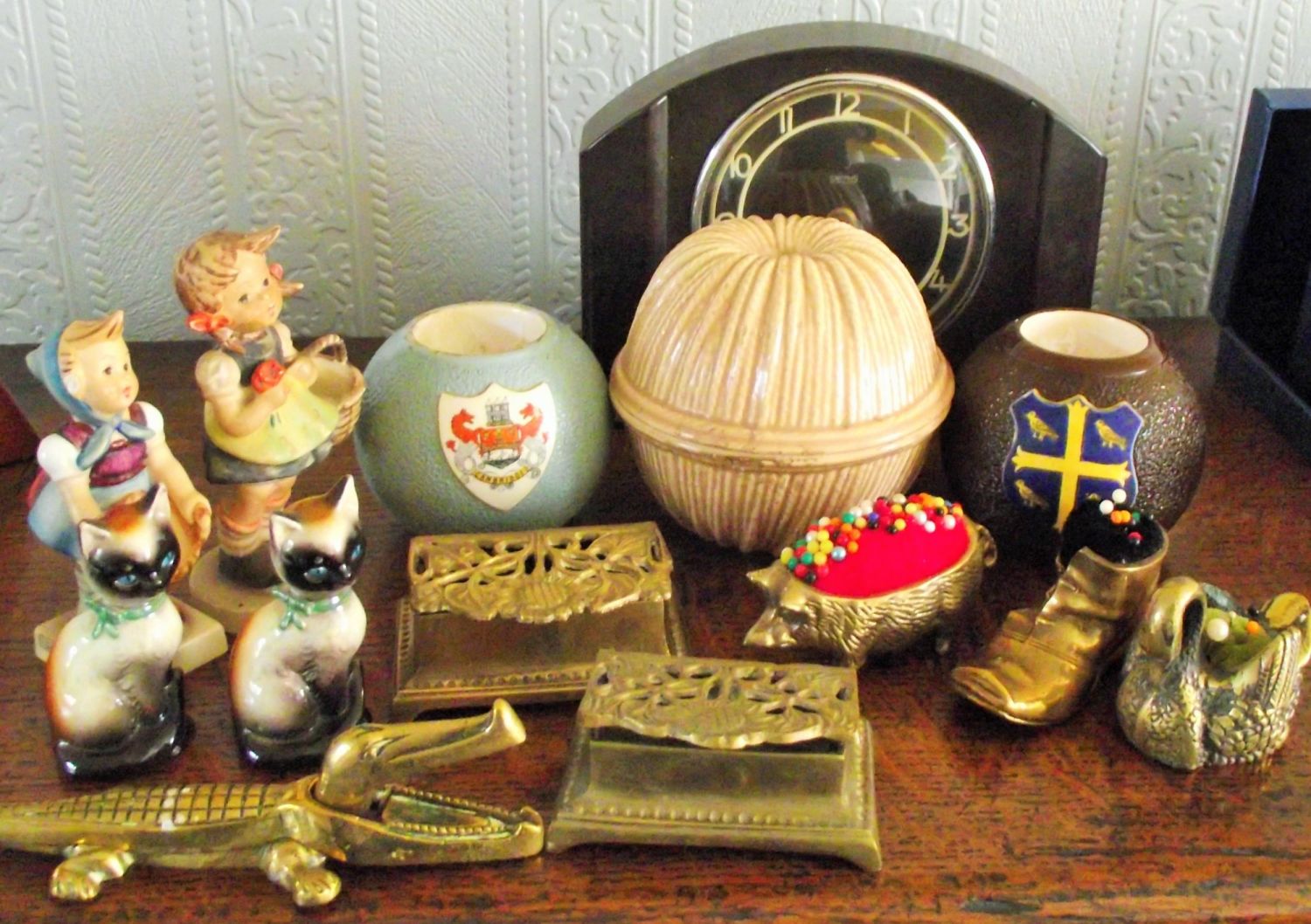 2 vintage match strikes both with shield motifs + 2 Geobel girl figures & 2 Geobel cat figures + vintage Smiths Bakelite clock + vintage loos string holder + 3 brass pin cushions & 2 brass stamp holders + brass nutcrackers