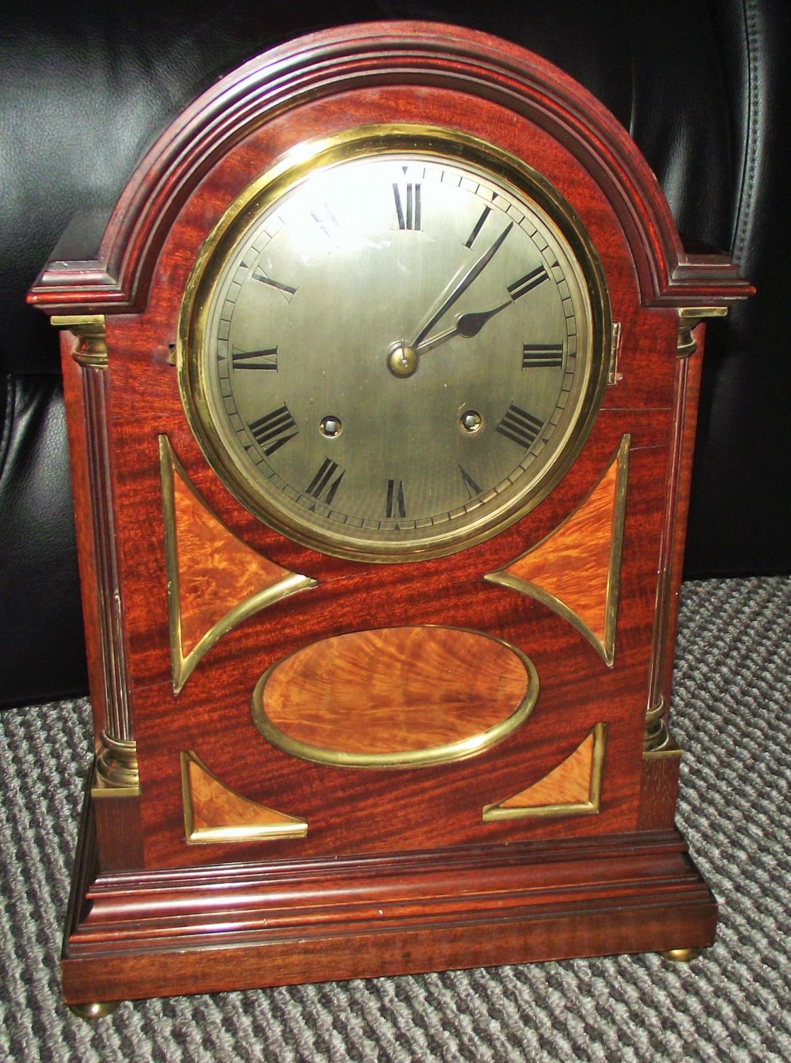 Large English Regency revival Bracket clock Circa1910 Mahogany case with brass & walnut embellishments. 2 train barrel striking movement ( English Movement ) with key .( seen ticking ) 17 tall & 12 wide with original purchase paperwork