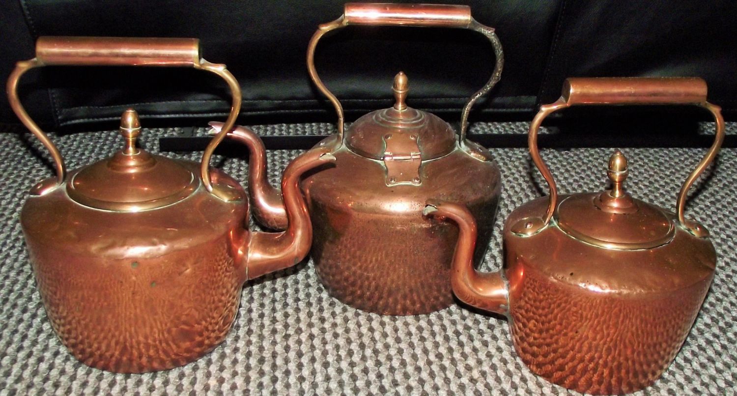 3x nice Antique copper kettles 1 with hinged lid