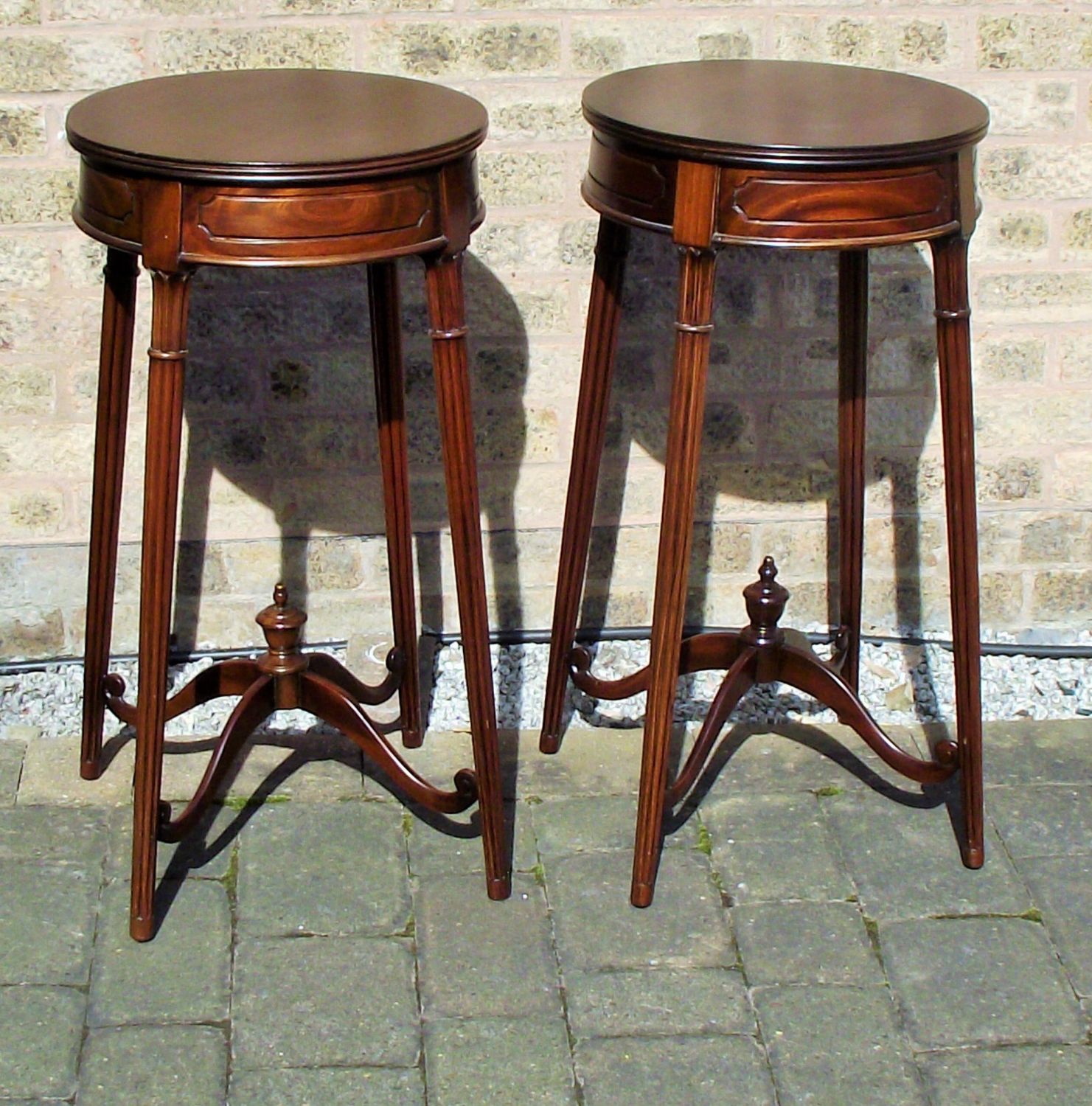 Pair of good quality tall modern mahogany colour circular topped lamp tables 29 high