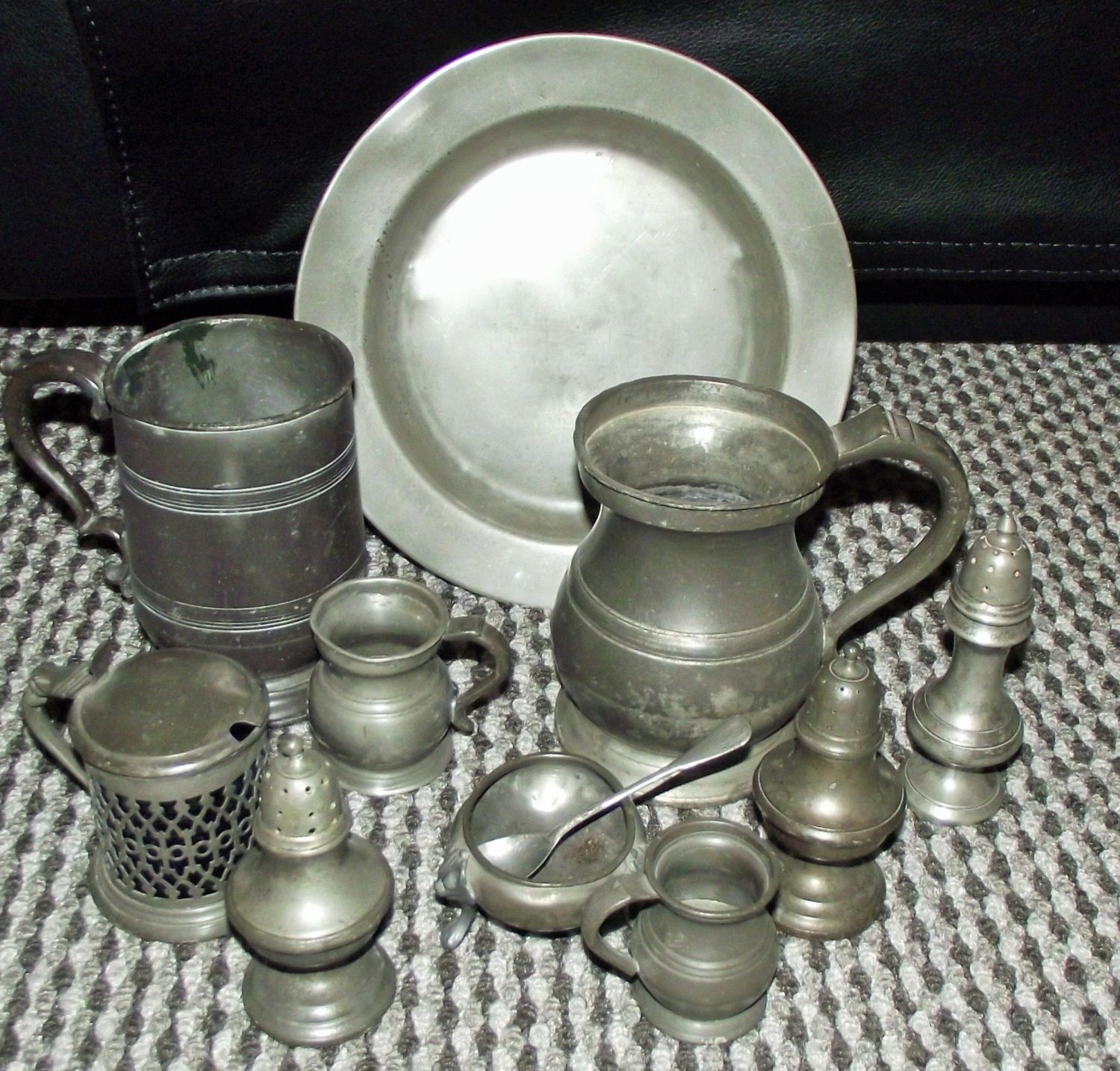 Small Antique 18thc pewter plate with touch mark on reverse stamped London + selection of Antique pewter tankards , salt & peppers , pierced sided preserve pot &2 pewter measures one marked Half Gill .