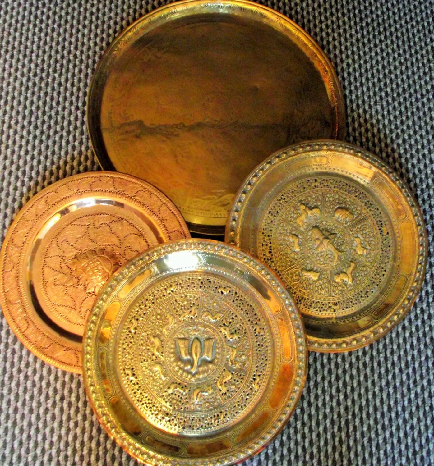 Large embossed brass Islamic style tray + 3 other brass & copper style trays with embossed designs largest 47cm diameter, small trays 36cm diameter