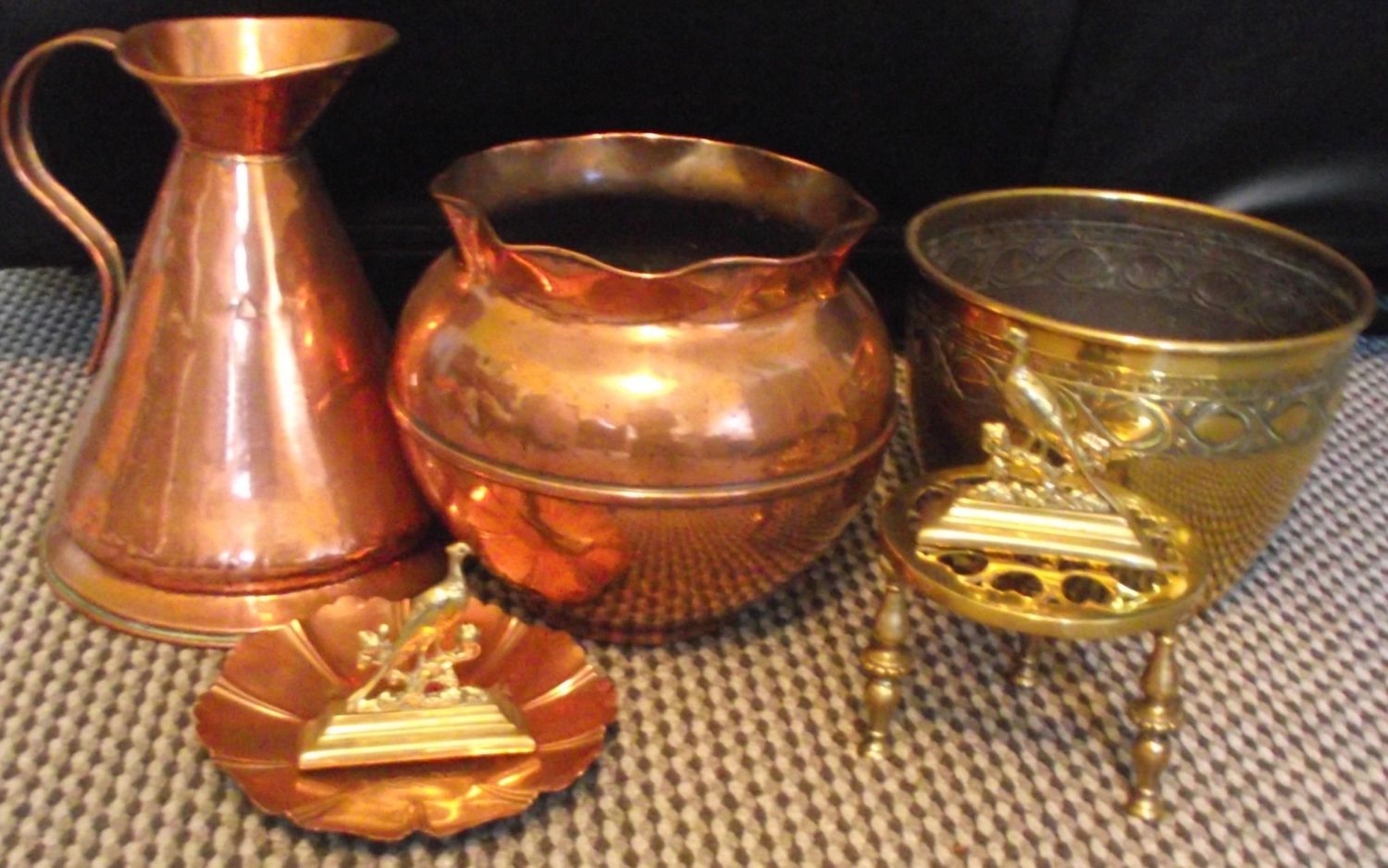 Large copper pitcher /flagon + copper planter and brass planter + brass trivet & pair of brass pheasant fireside ornaments + small embossed copper tray