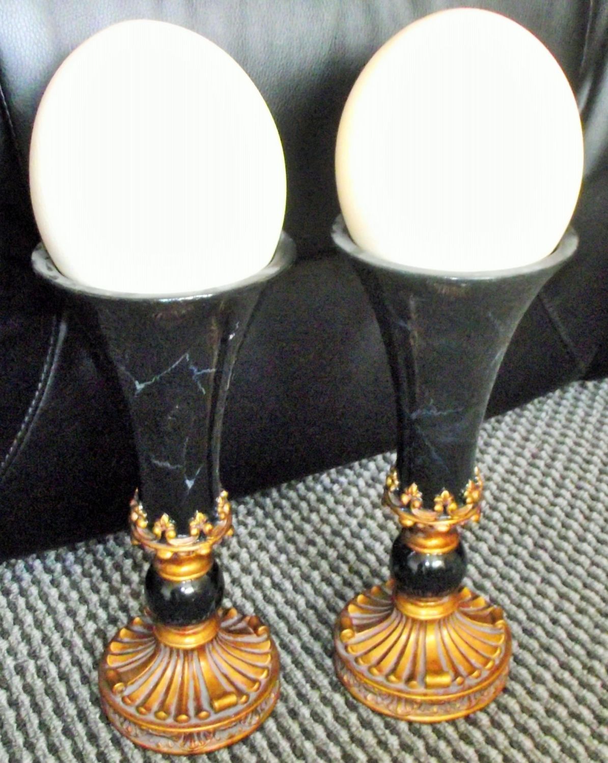 Pair of blue & gold decorative moulded vases both with a real blown ostrich egg on top each vase