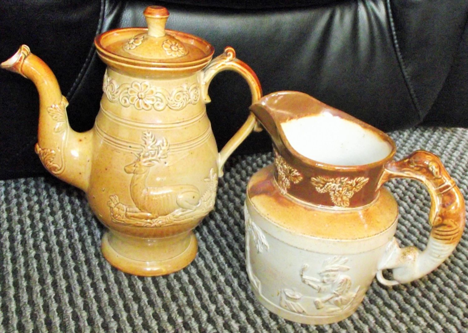 Unusual 19th century Brampton brown salt glazed stoneware coffee pot + stoneware hunting jug