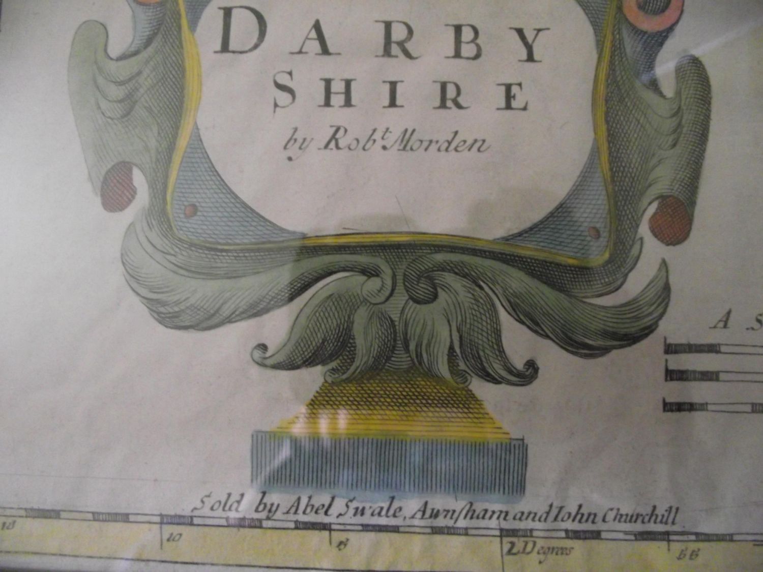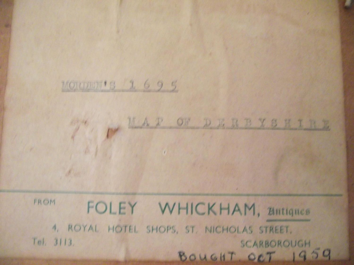 Framed & glazed Hand coloured map of Derbyshire by Robert Morden reverse label ( bought in 1959 foley antiques )