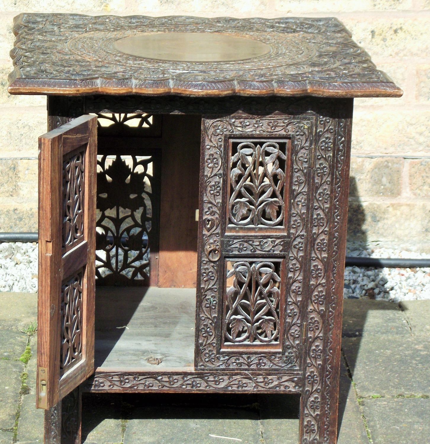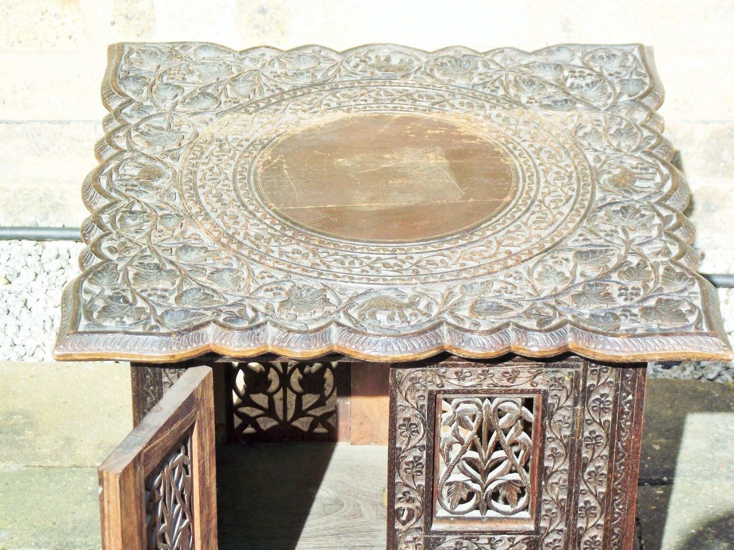 Vintage hardwood folding cabinet table with doors to front , carved with leaves and camels 17x17x17