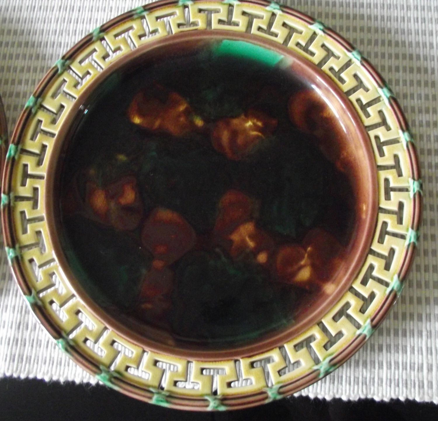 6 x Rare Wedgwood Majolica mottle glaze plates, shades of brown green and ochre. Greek Key reticulated border. Impressed Wedgwood marks to base. Circa 1860 9 diameter approx.
