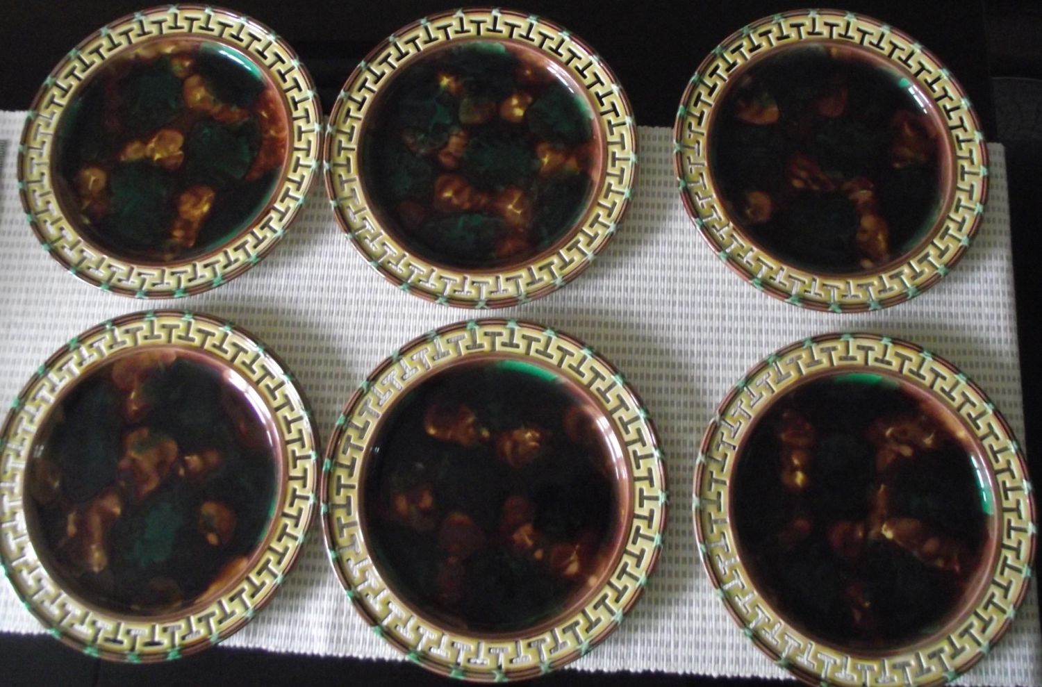 6 x Rare Wedgwood Majolica mottle glaze plates, shades of brown green and ochre. Greek Key reticulated border. Impressed Wedgwood marks to base. Circa 1860. 9 diameter approx.