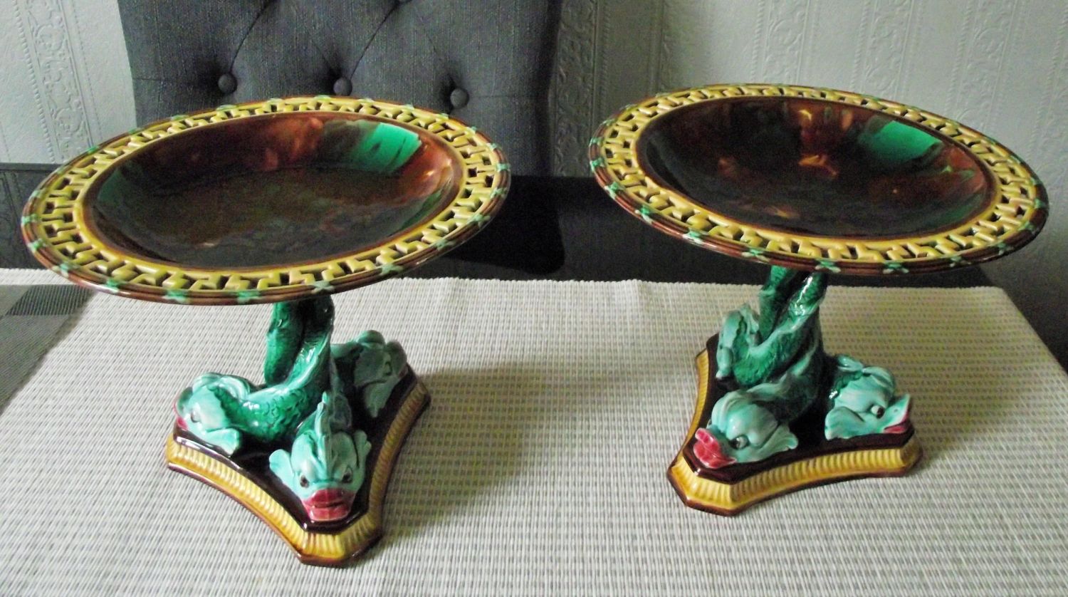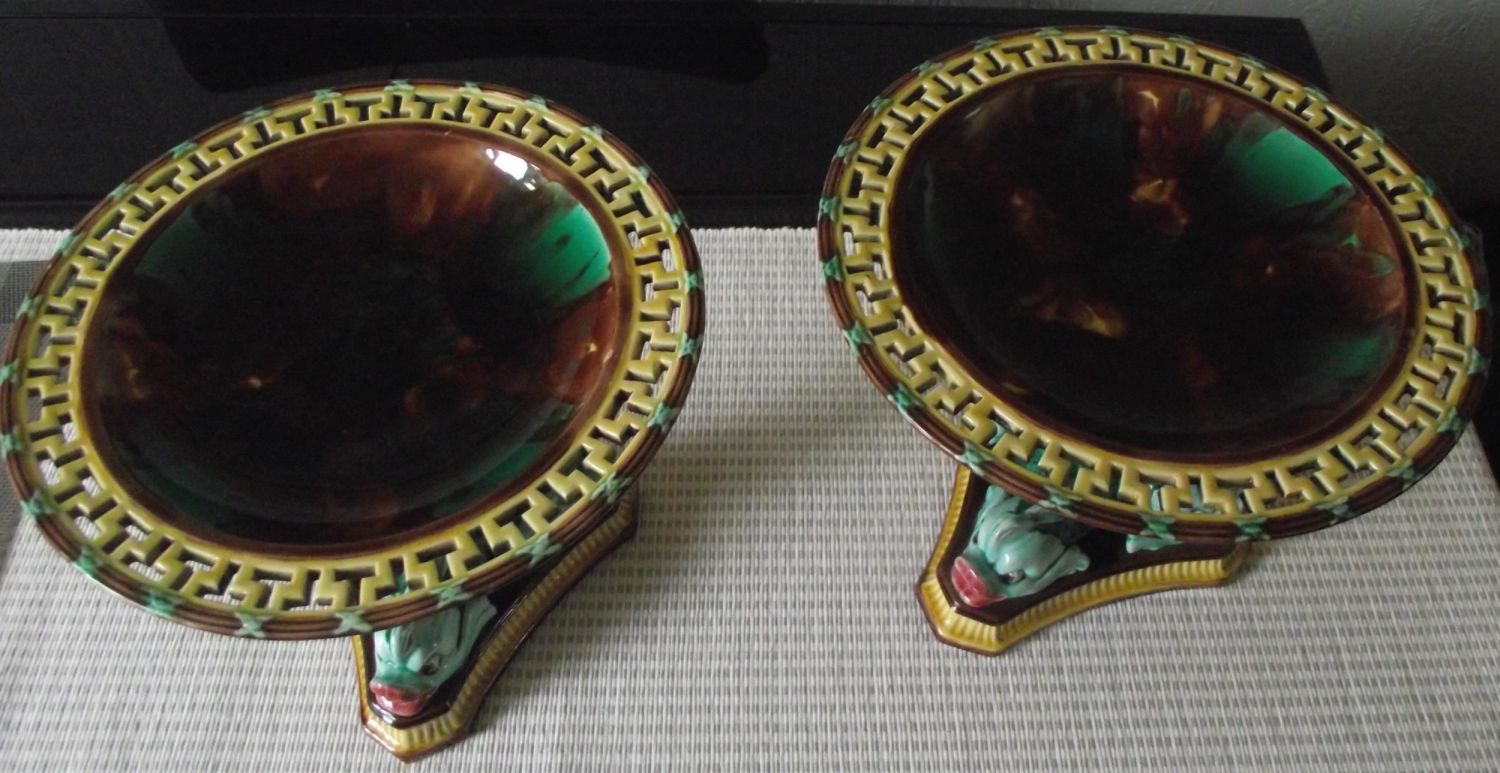 2x Rare Wedgwood Majolica mottle glaze dolphin stem Tazzas , shades of brown green and ochre. Greek Key reticulated border. Impressed Wedgwood mark. Circa 1860. 7 high 9 diameter approx.