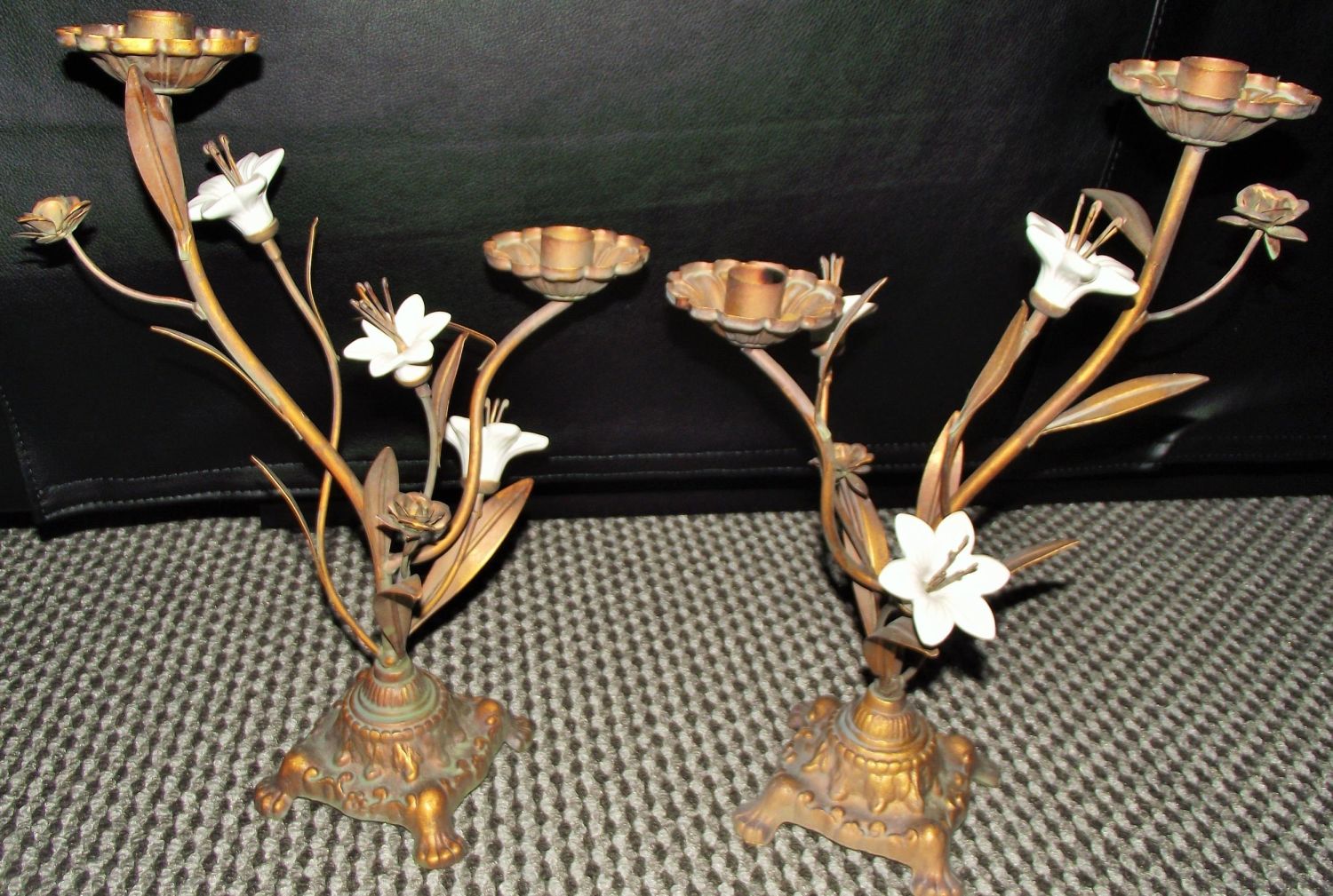 Pair of gilt metal flower style candle stands with white porcelain flower heads 15 high .