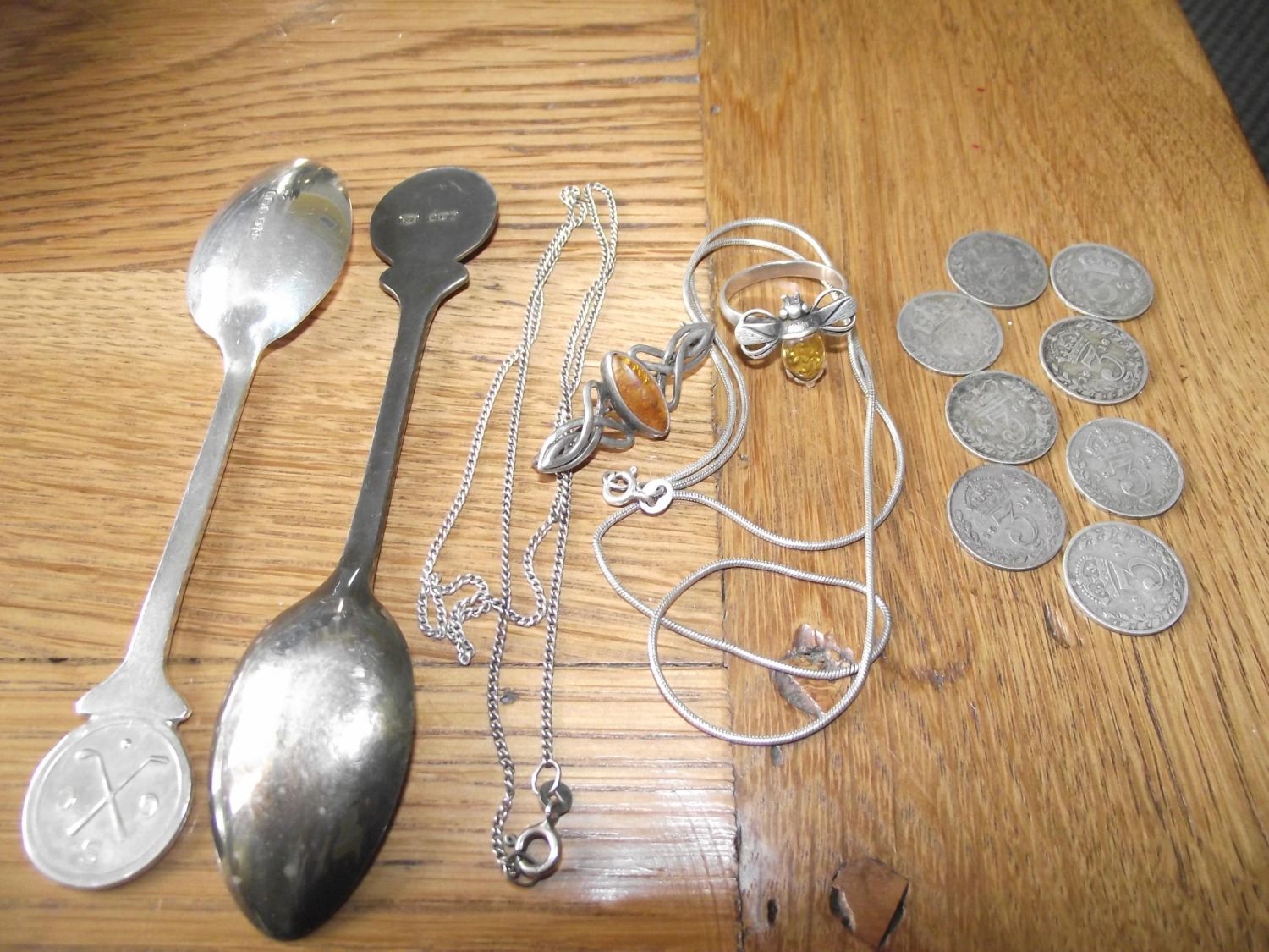 Selection of silver Items Inc. amber style Bee ring , pin brooch , neck chains , silver 3d coins ( all pre 1919) 2 x silver spoons 54g approx.