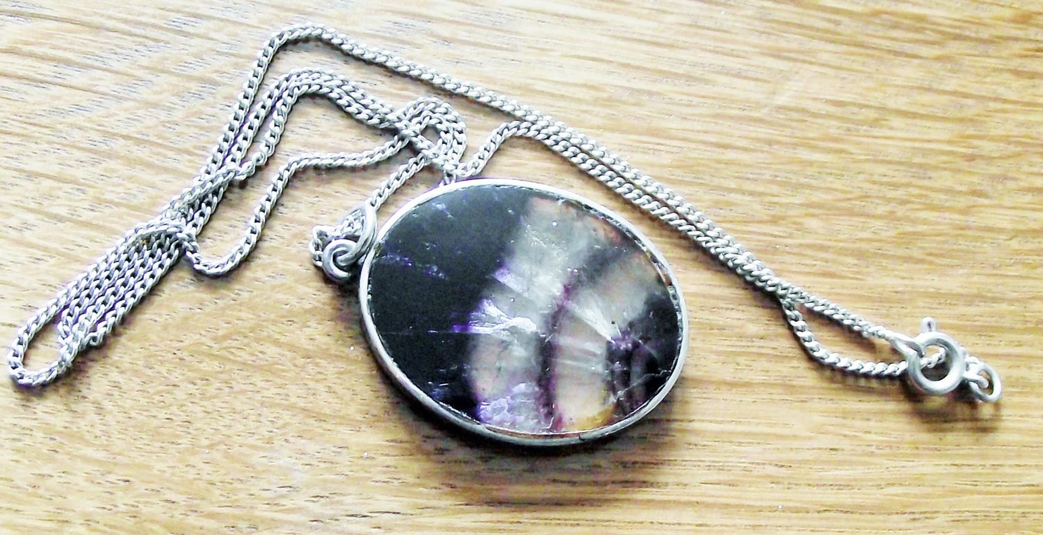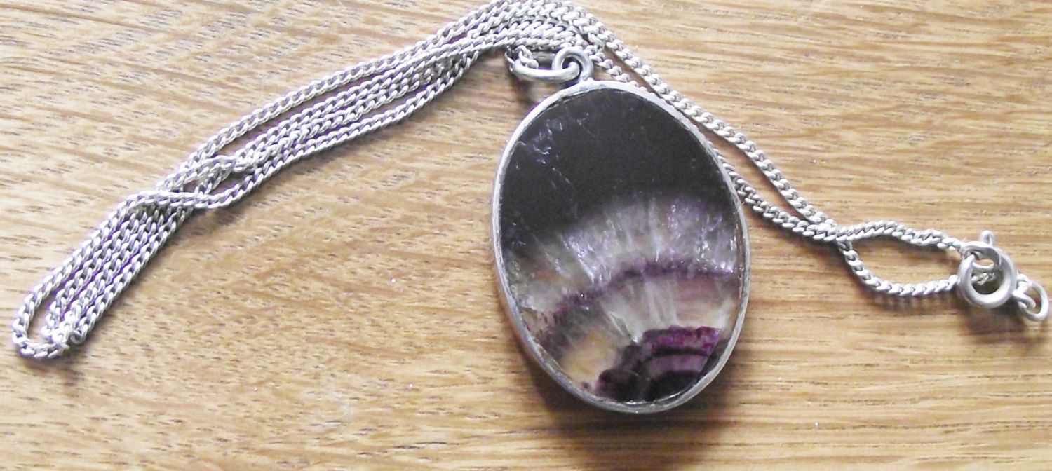 Silver oval shaped double sided blue john pendant on 8 silver chain