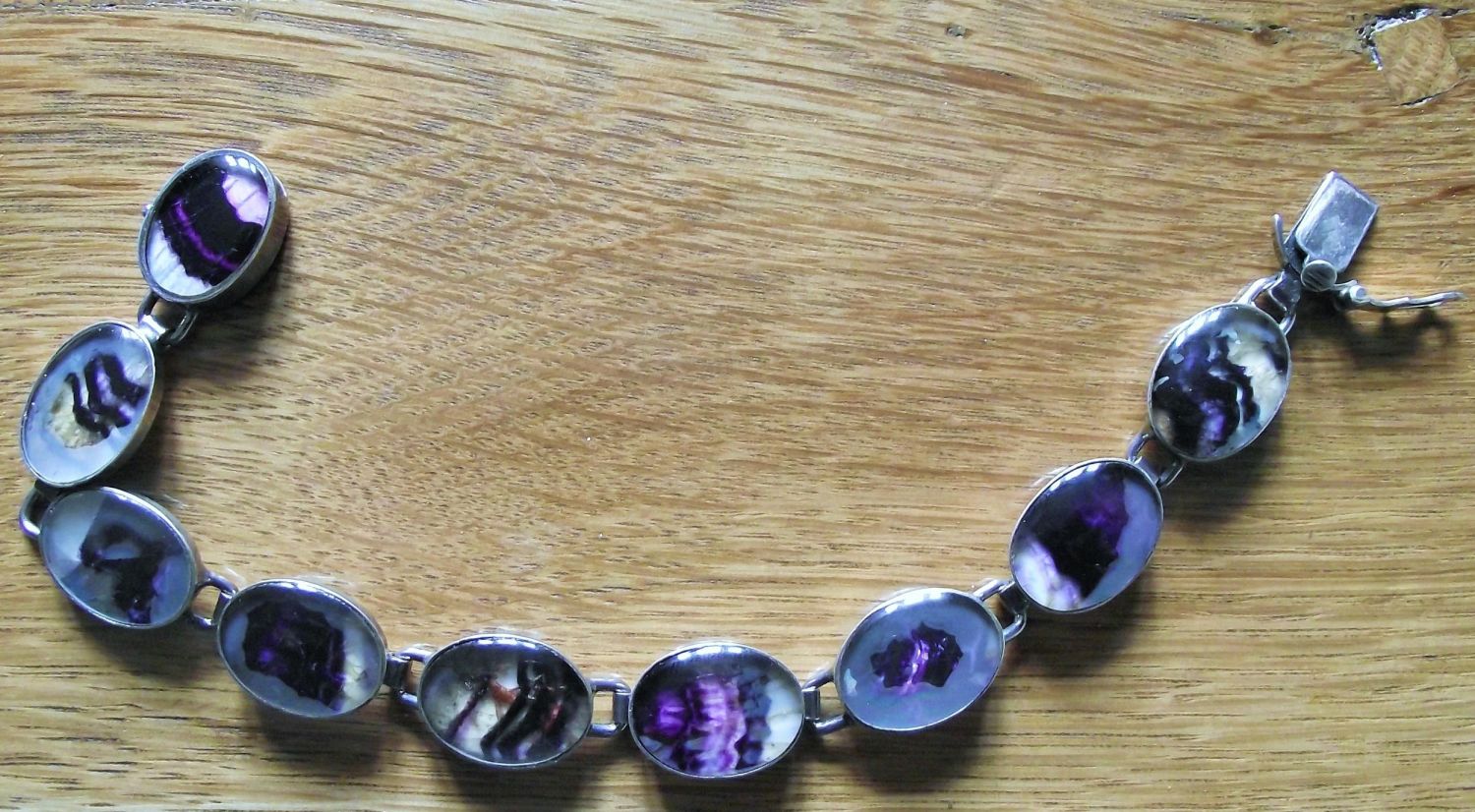 Silver blue john 8 bracelet made up of 9 separate cabochon style stones ( some stones showing discolouration) 25.4g approx.