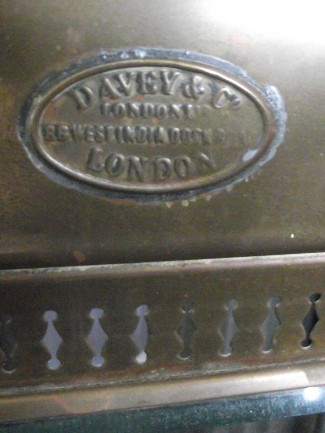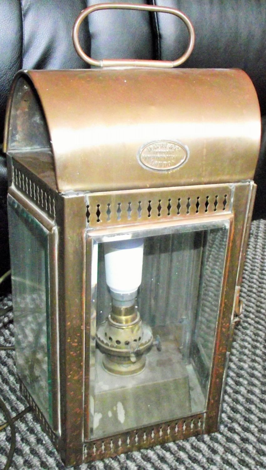 vintage Davey & Co. of London copper ship’s kerosene lamp converted to electric with original bevel glass front & sides , original kerosene lamp base ,and oval Davey & co impressed cartouche to top of lamp ( All electricals must be tested by a qualified electrician before use ).