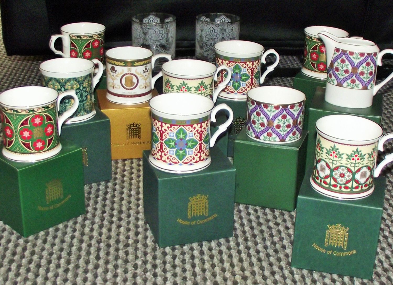 Selection of boxed Rare ltd edition mugs ( limited to 1000 production) exclusively made for House of Commons & Palace of Westminster each mug numbered + 2x Houses of Commons engraved whisky tumblers + cream jug exclusively made for House of commons (13)