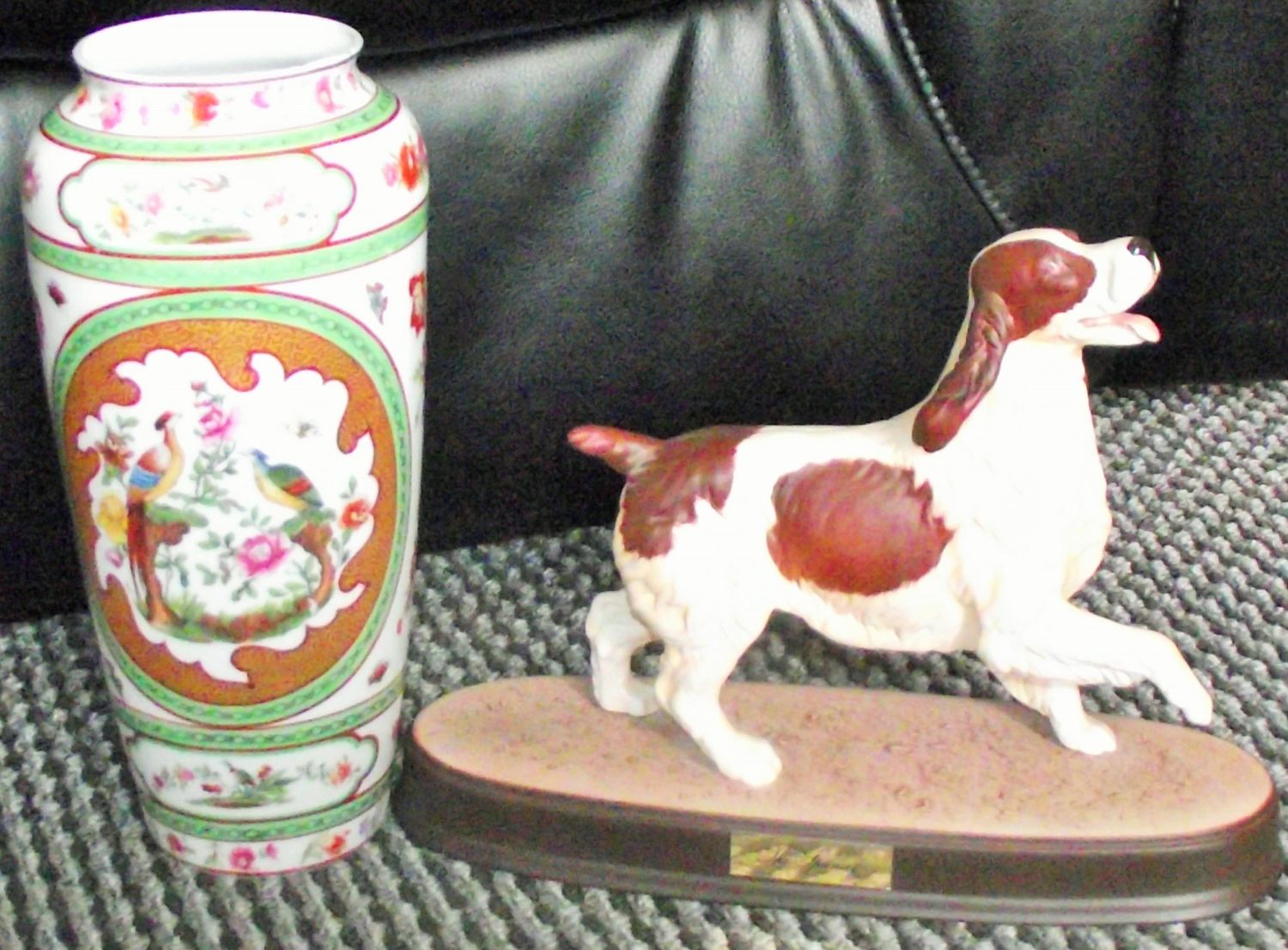 Sevres style porcelain vase decorated with panels of Asiatic birds, flowers and butterflies. Underglaze mark to base + Beswick model The spaniel mounted on wooden base with name plaque
