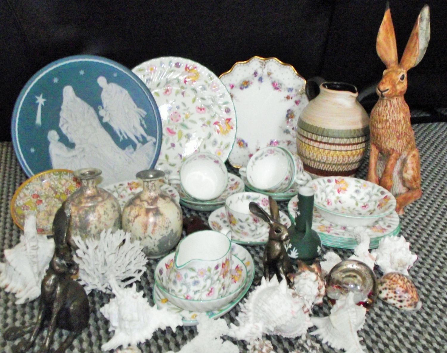 Mixed lot Inc. Royal crown Derby plate , Villeroy & Bosch plate Haddon hall Minton part set ,Large pottery hare & 2 others ,Selection of assorted shells & coral