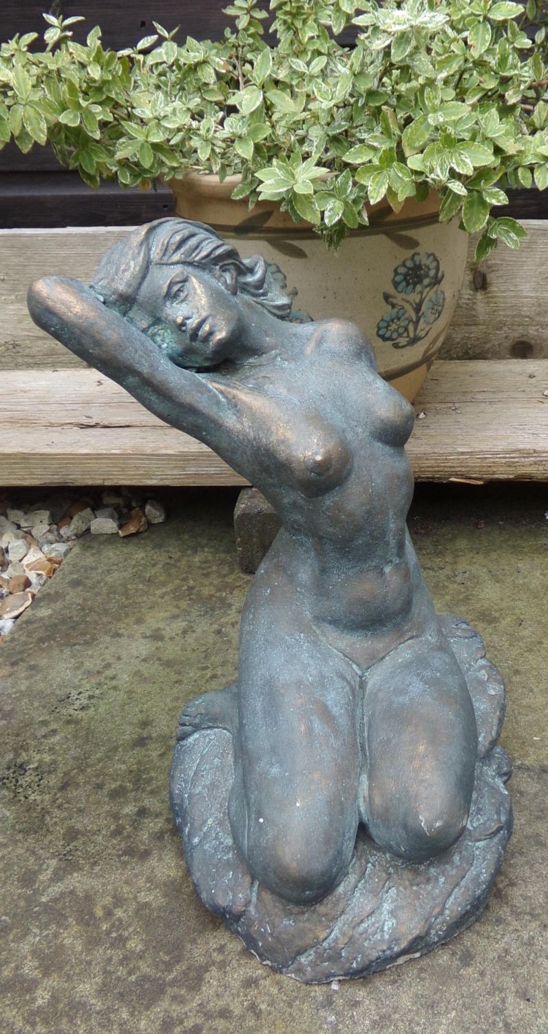 Bronze coated effect moulded concrete garden ornament of a semi naked girl posing on rocks 13 high