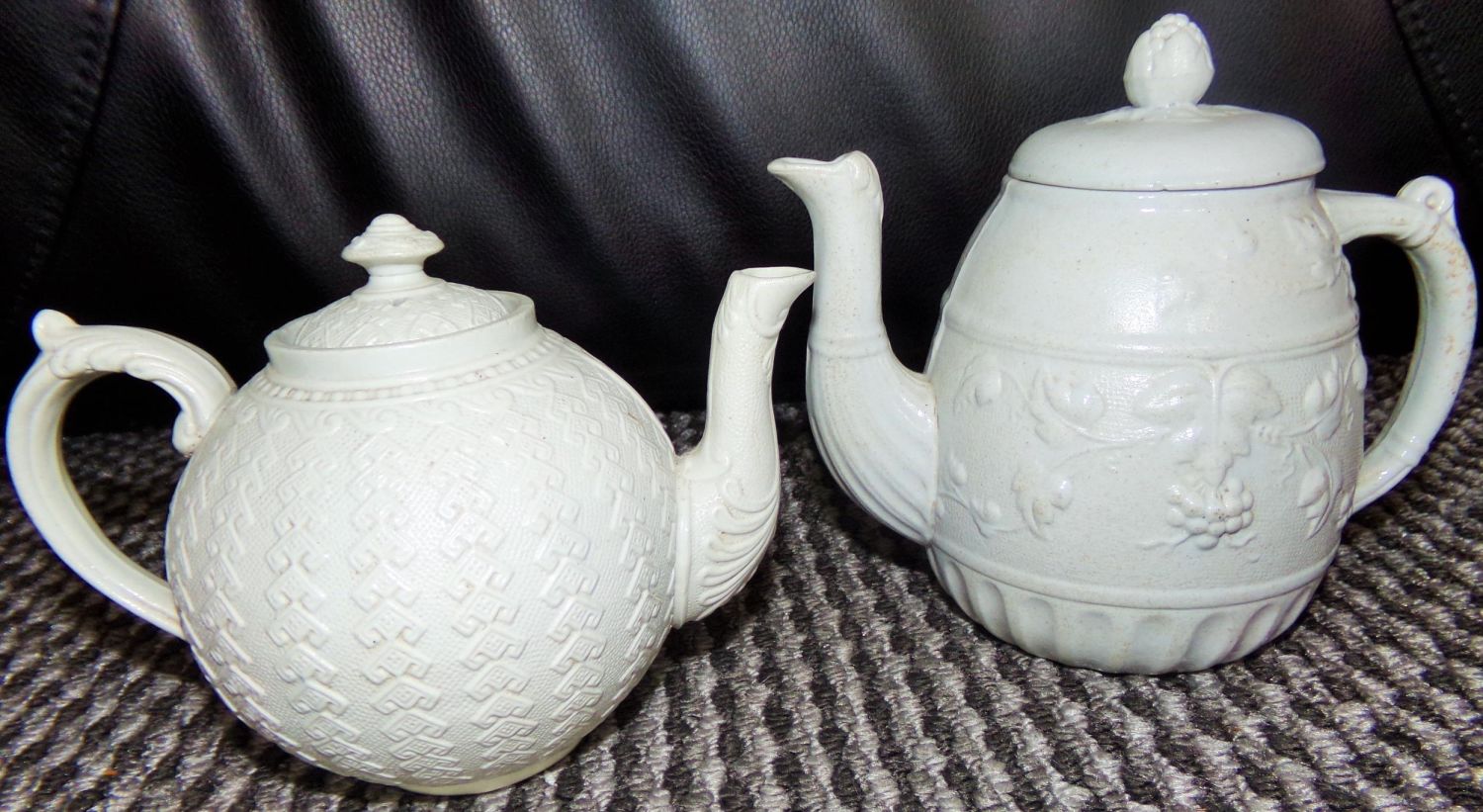 2x Antique cream ware tea pots .The larger 6 tall decorated with fluted spout grapevine design to body and sprig handle acorn finial . The smaller 5 tall rounded bulbous bodied tea pot decorated with lattice work design with sprig handle.