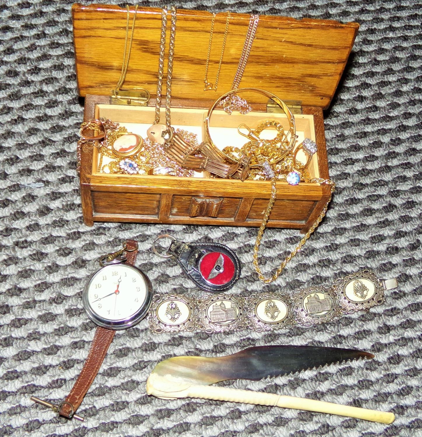 Nice Small collection of plated and rolled gold costume jewellery rings , chains , bangle in a small oak musical box resembling a miniature blanket box + stainless Smiths empire pocket watch( working) + horn carved knife and carved pipe etc .