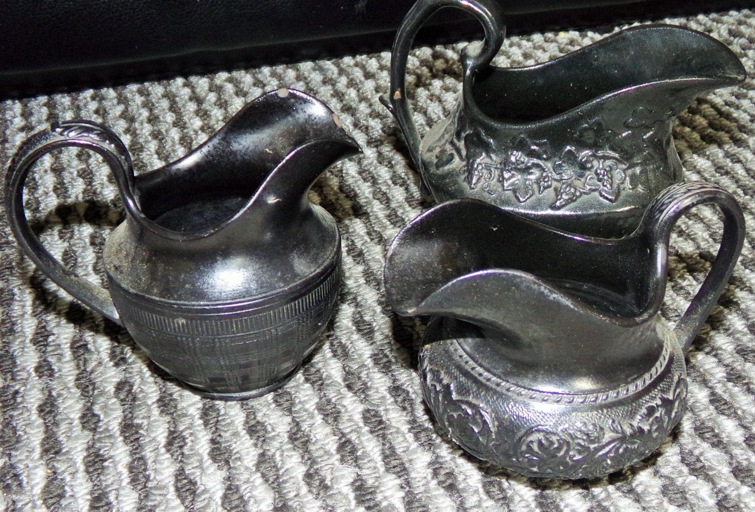 3x Victorian black basalt cream jugs in various sizes and various decoration.