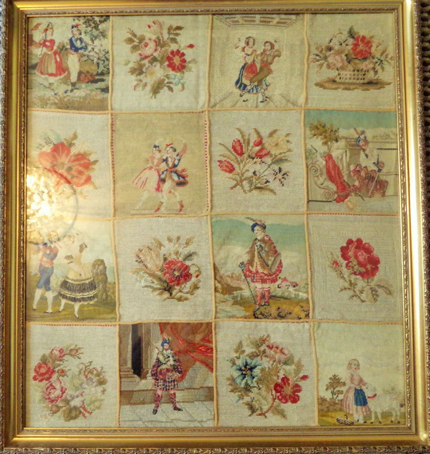 Unusual Large Antique framed & glazed wool work picture each panel separated with rope into panels 28×25 approx.
