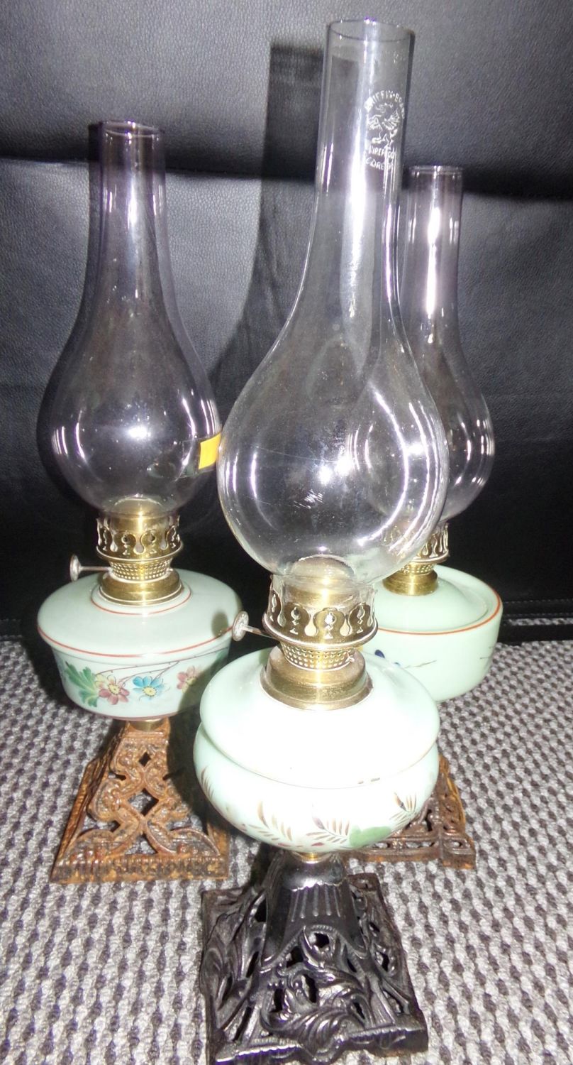 3x Victorian style oil lamps with funnels raised on wrought iron bases painted designs on light green glass reservoirs .