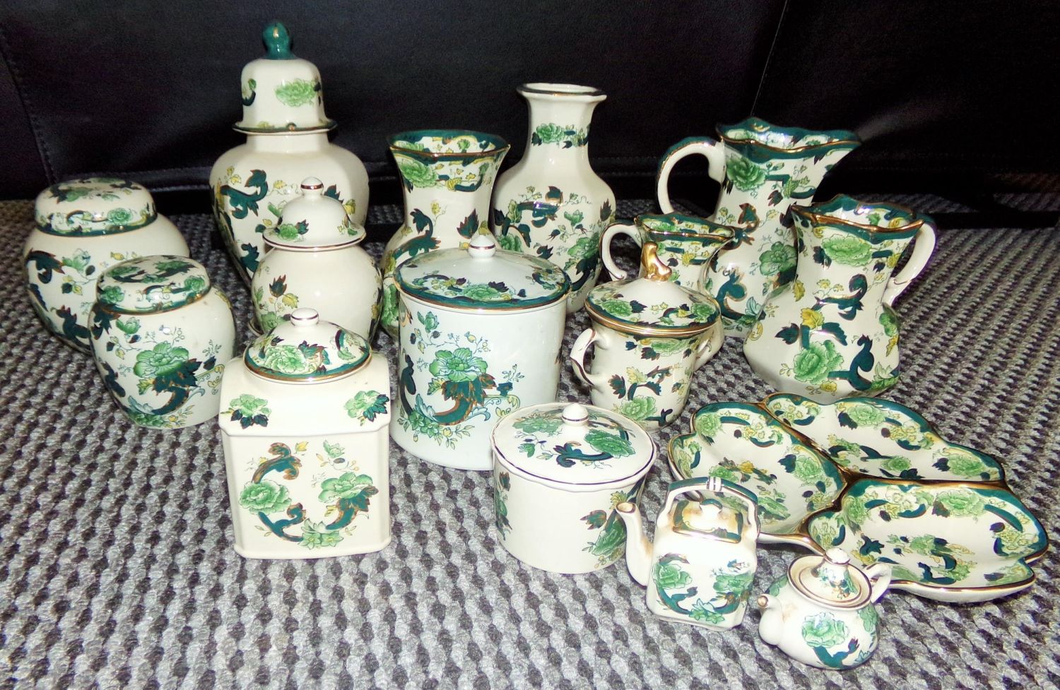 Selection of Masons Chartreuse green pattern pottery Inc. biscuit barrel , ginger jars vases, graduated jugs ,2 miniatures (16) etc.