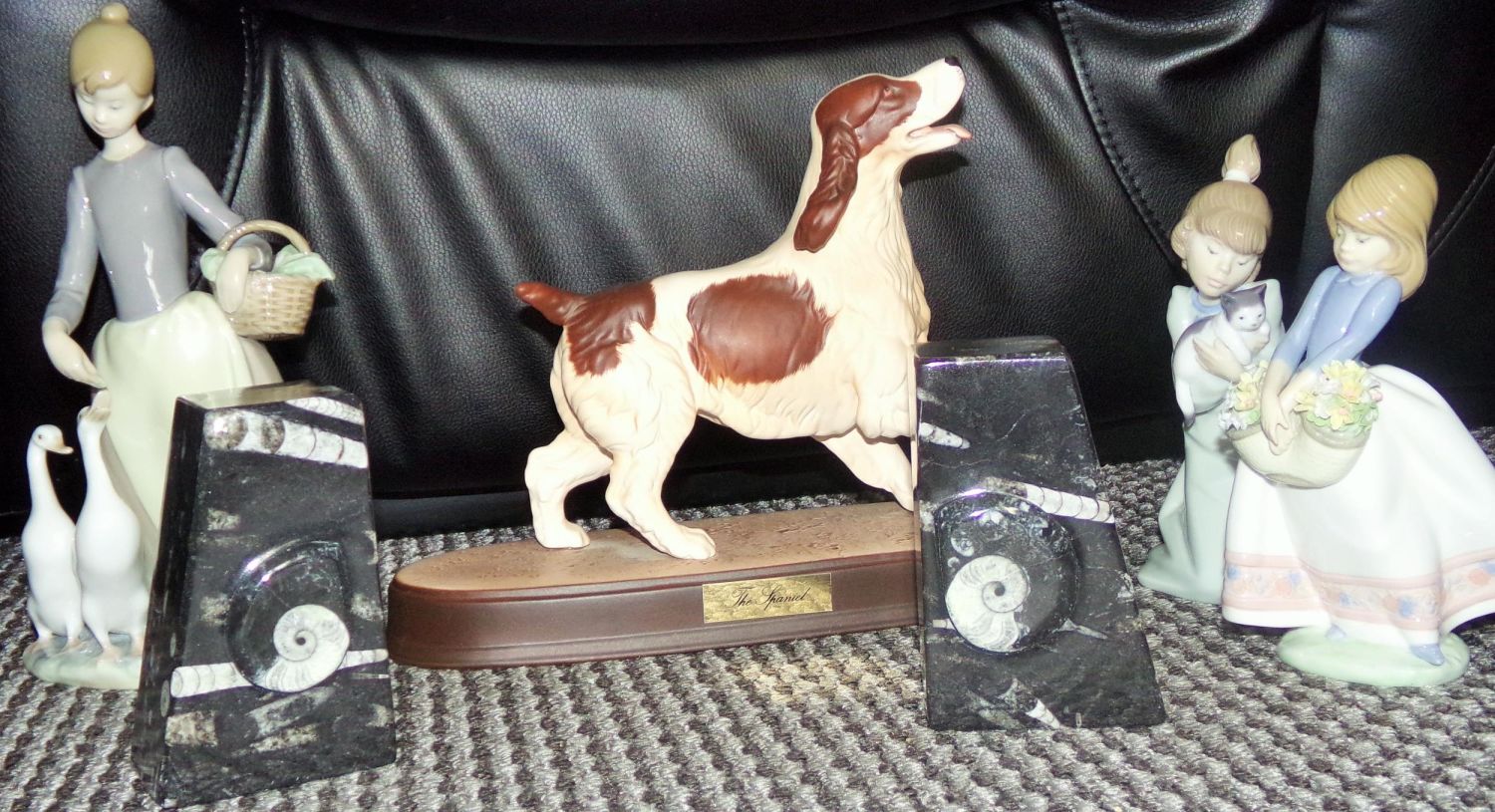 Beswick matt gazed spaniel model on wooden plinth stamped underside 12L x 8h+ Pair of marble block bookends with ammonite design+ 3 x Lladro figures No 5467, 5712 ,1306 all marked Lladro underside.