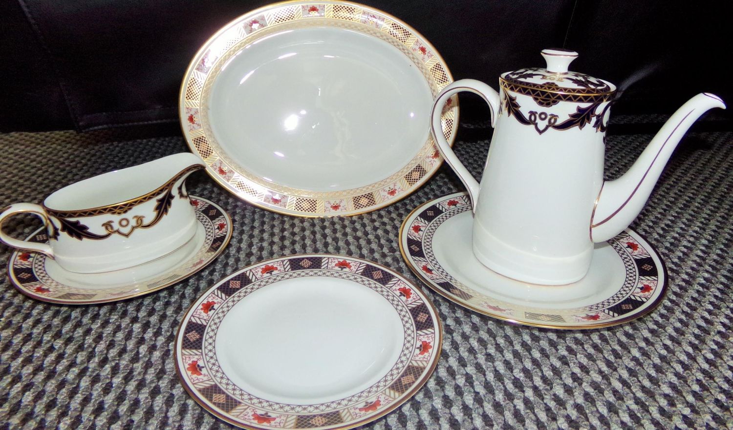 Royal Crown Derby Derby border pattern oval meat plate , 10.5 plate ,2x 8.5 plates + Crown Derby Majesty gravy boat & coffee pot