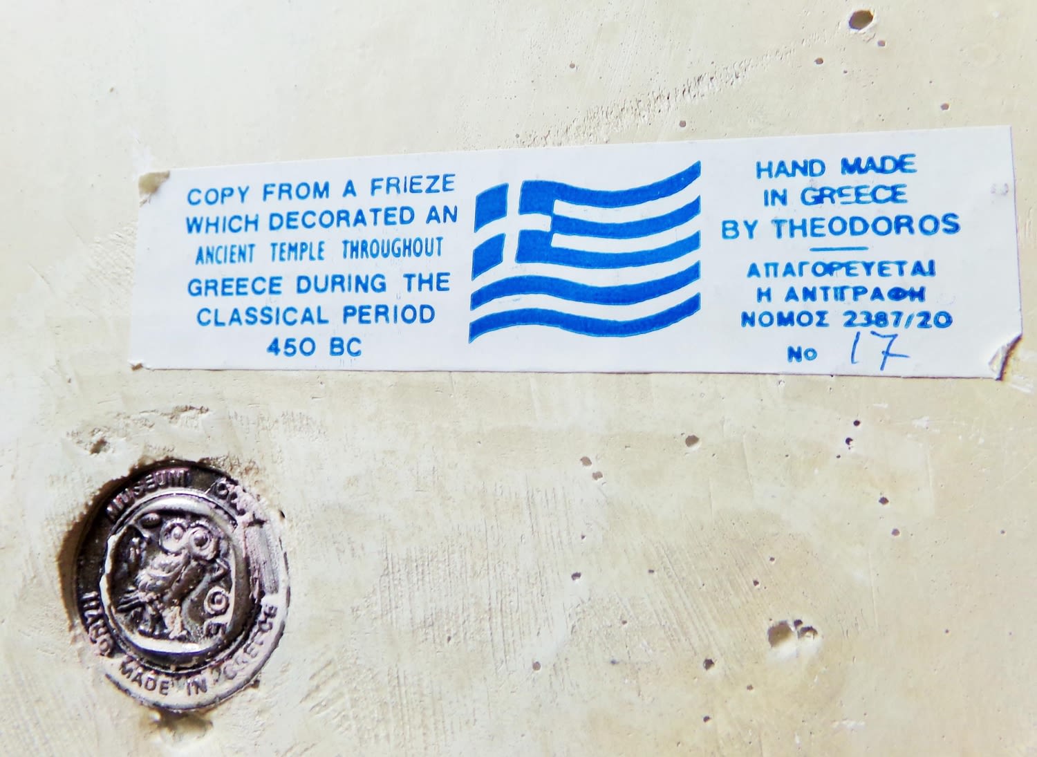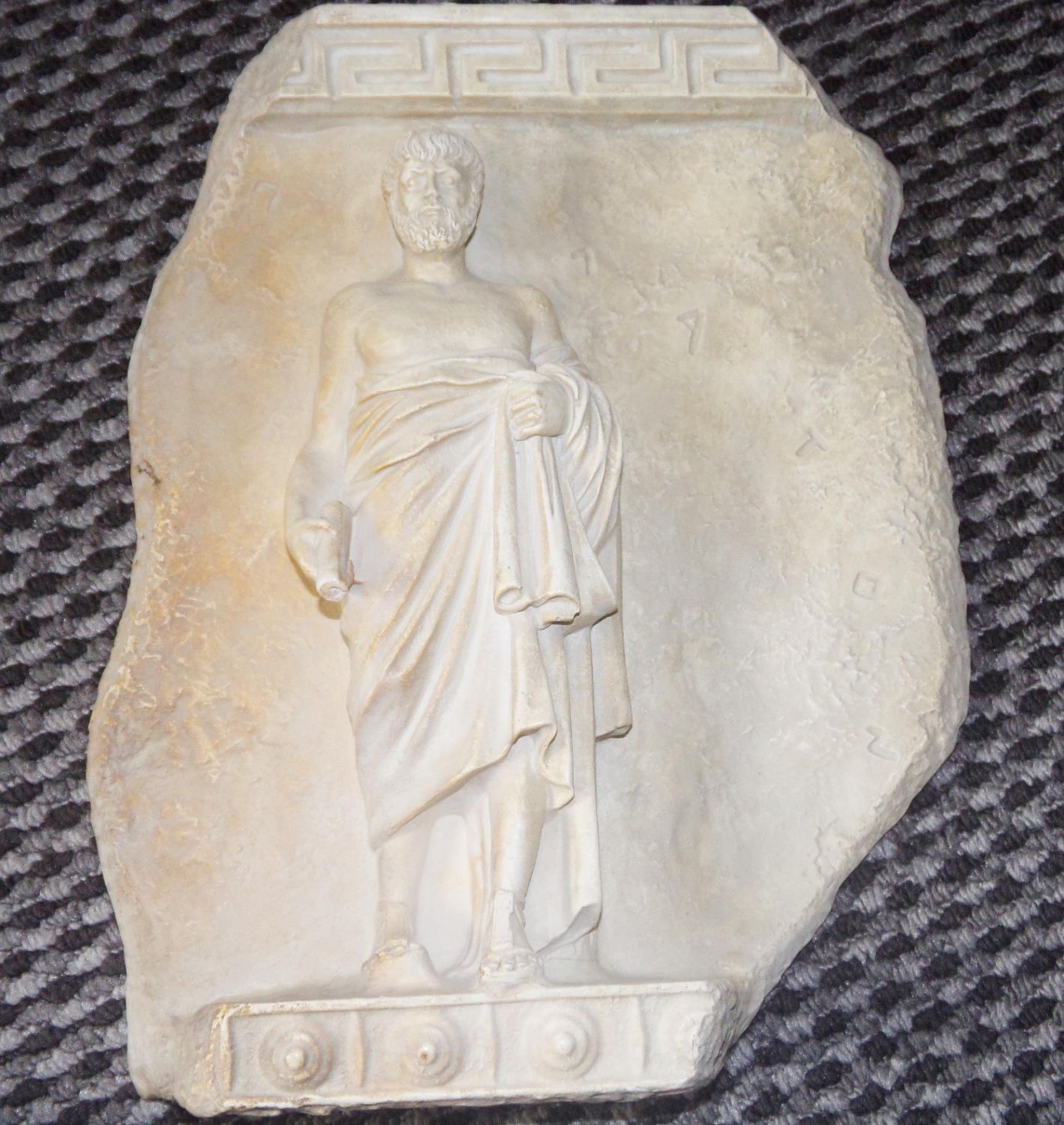 Unusual Alabaster copy of Heraclitus an ancient Greek philosopher. Label on reverse Hand made in Greece by Teodoros .No17, Metal Museum copy badge embedded into back . 14×10 approx.